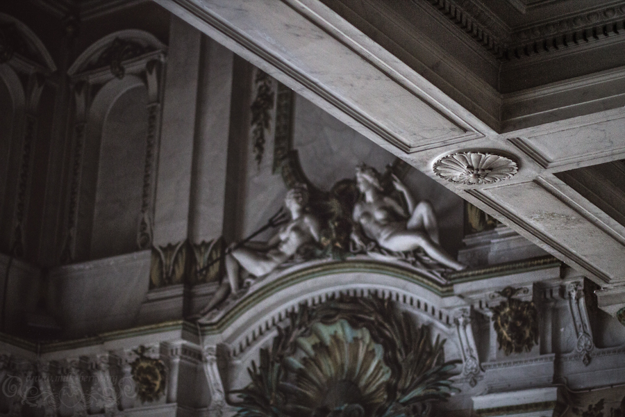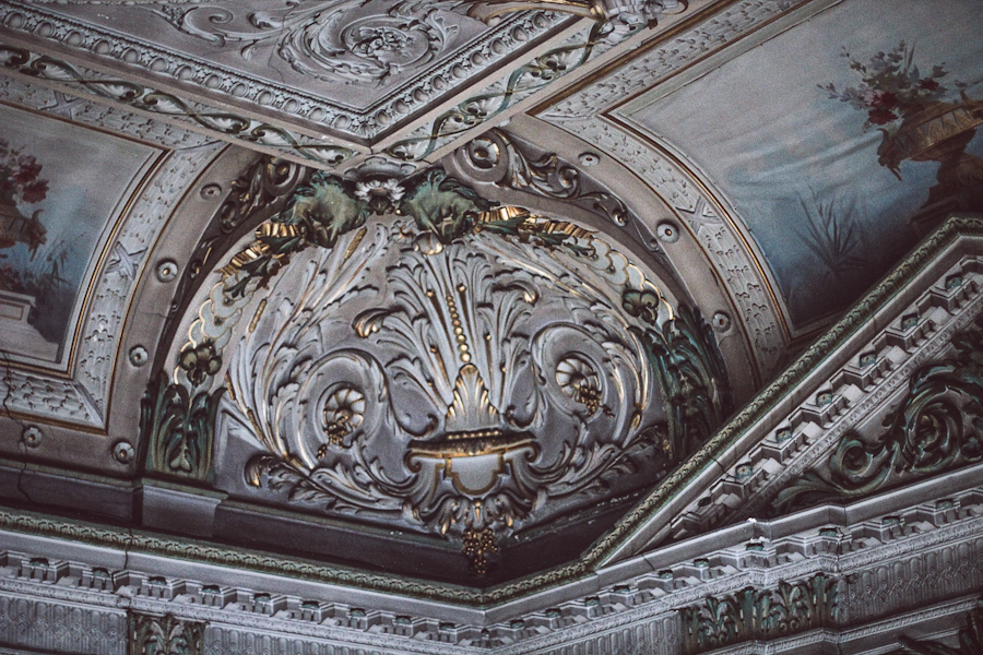 Mais ce que je veux absolument voir, c’est bien sûr, le fameux hall. Celui qu’on voit en photo partout. Celui dont le balcon est déjà occupé par une flopée d’autres photographes quand on y arrive. Ils sont équipés, moi j’ai oublié mon trépied, j’ai pas de grand angle, alors à défaut de pouvoir prendre une photo potable du plafond et des ornements, je me concentre sur les détails. Assez tristes d’ailleurs, les murs se fissurent et les colonnes ont clairement perdu de leur éclat.