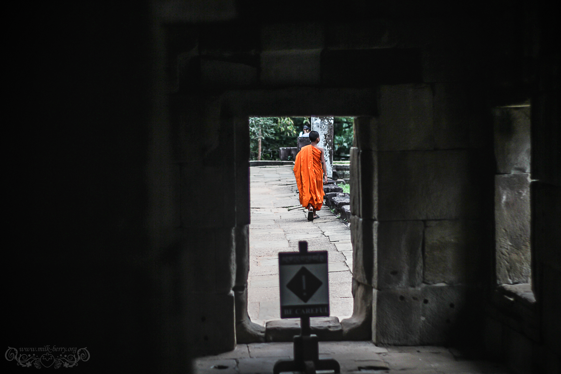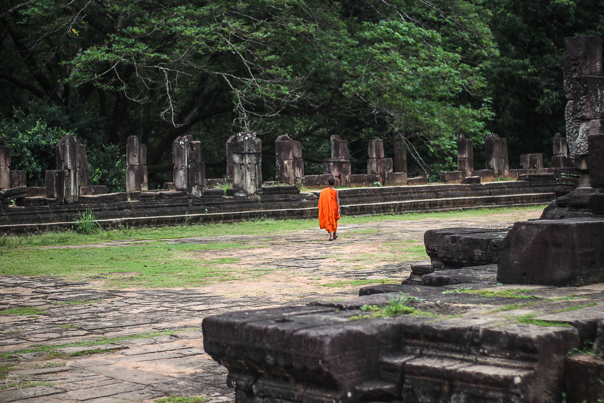 À peine arrivés, on peut apercevoir au loin les silhouettes de moines dont l’orange vif de la tenue tranche dans un décor verdâtre.