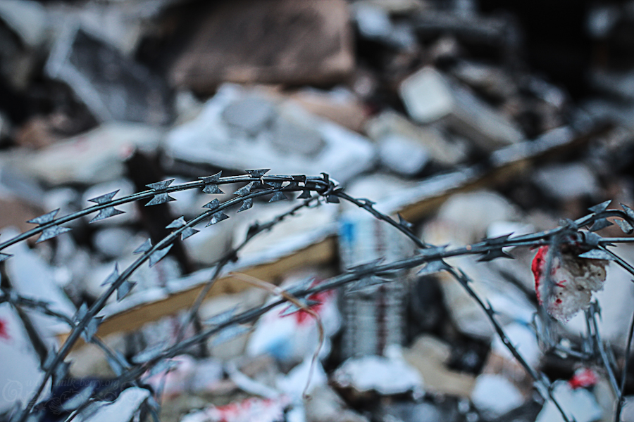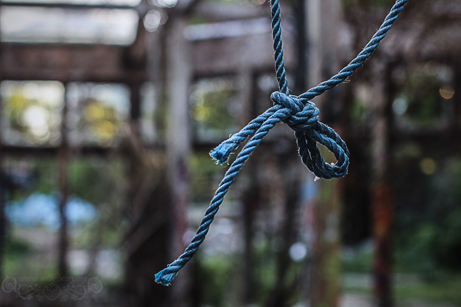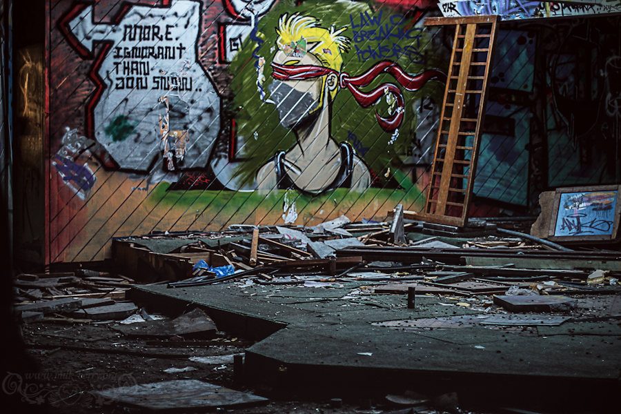 À l’intérieur, on croise pas mal de gamins venus se promener. D’ailleurs quand on dit que ce genre de lieu est dangereux et que « qui fait l’malin tombe dans l’ravin »… J’ai du donner un sparadrap (rose) à l’un d’entre eux qui s’était bien ouvert le doigt probablement sur du verre brisé. En dehors des gosses, il y a également une troupe de performers installant des enceintes tandis que d’autres sont sur les toits en train d’attacher des cordes aux poutres du plafond. Probablement qu’une soirée ou un spectacle se prépare ! On reste assis un moment, observant une jeune fille faire l’acrobate sur des cordes pour régler les attaches aux poutres.