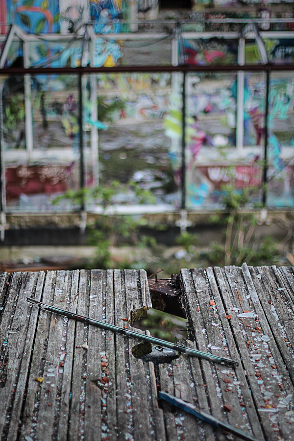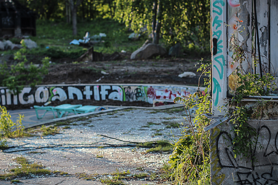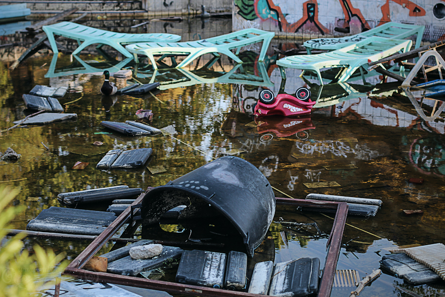 On est vite accostés par deux gamins qui nous demandent dans un anglais approximatif si on fume de la « weed »… Merci mais non merci p’tit gars ! On fait le tour de l’extérieur, tout est bien dézingué : pratiquement toutes les vitres sont brisées et les lieux sont couverts de tags. Un canard a pris possession du fond d’eau de pluie restée dans le bassin, où se trouvent encore quelques anciens transats.