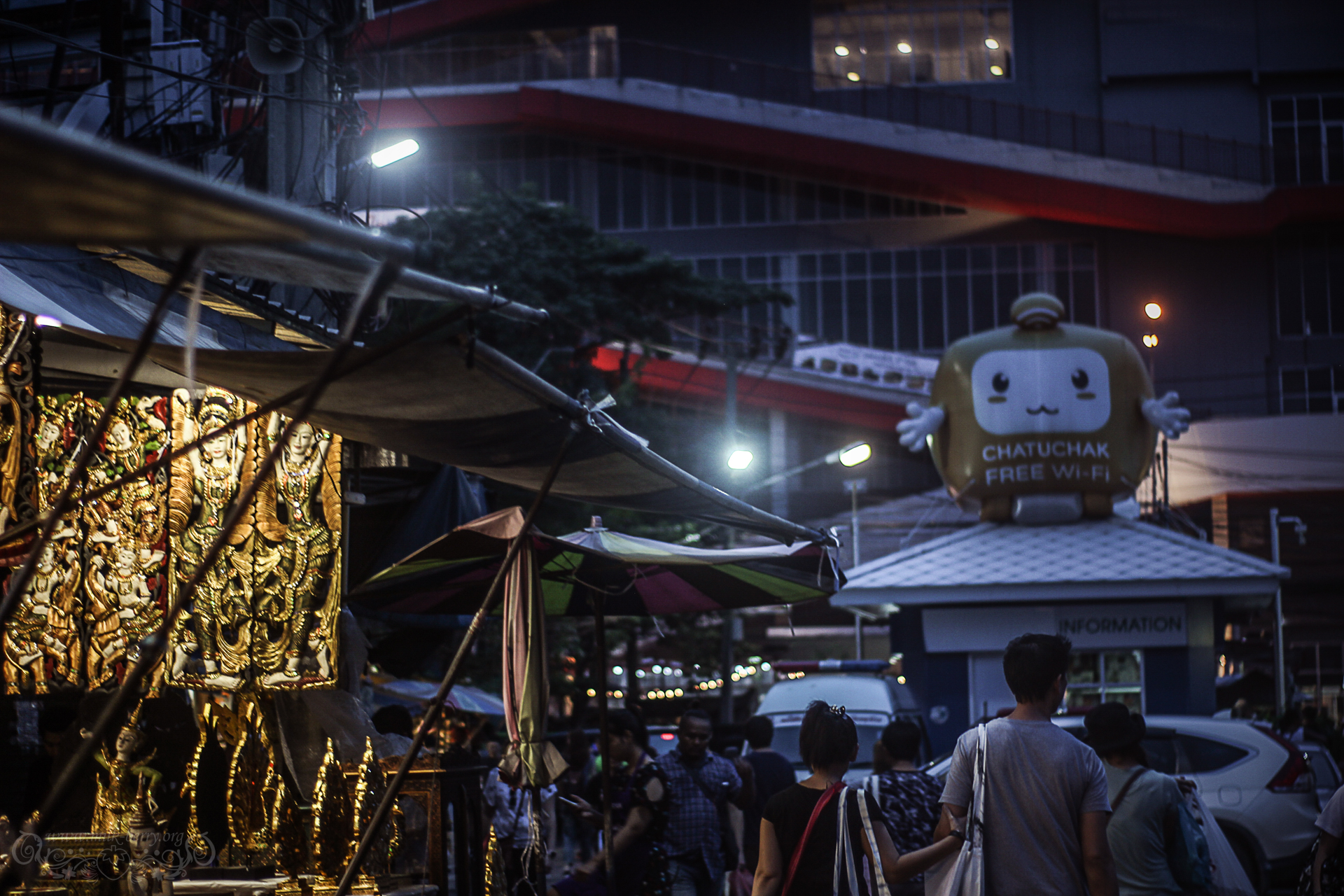 Nous sommes déjà l’après-midi lorsque nous émergeons enfin du fond de notre lit. Dehors, le ciel brumeux masque l’horizon suite à la pluie. L’humidité de l’air nous assaille et c’est péniblement que nous nous mettons en route pour le Chatuchak Week-end Market.