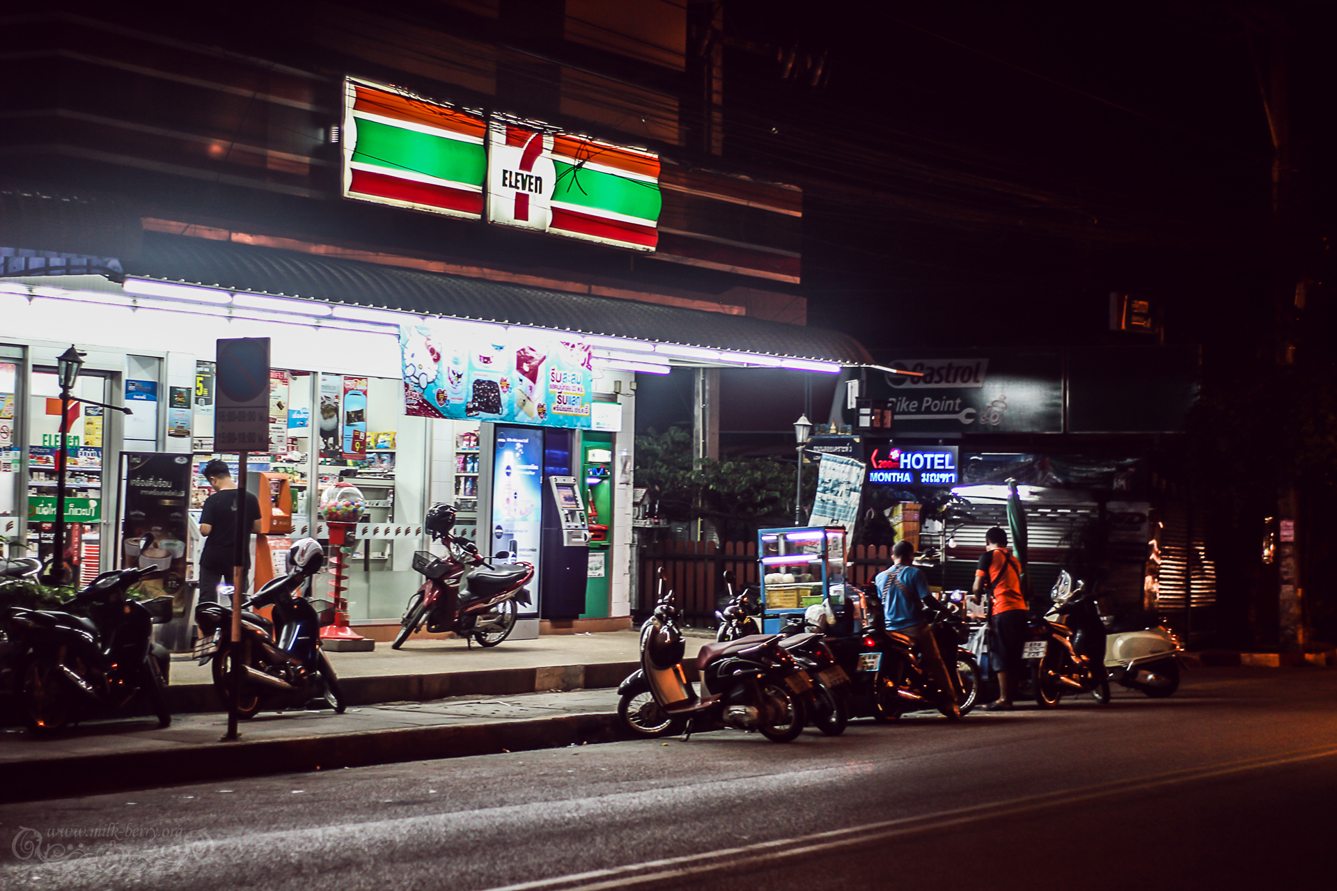 Si la journée nous étions en vadrouille loin de la ville, chaque soir, nous errions au hasard en quête d’un lieu où nous repaître. Notre hôtel était à l’extérieur de l’ancienne ville, mais quelques minutes de marche suffisaient pour la rejoindre. Ce qui fait la particularité de Chiang Mai, c’est que l’ancienne ville, remplie de temples divers, forme un carré bordé d’un cours d’eau. Superbe à voir, mais difficile à rendre en photo de nuit…