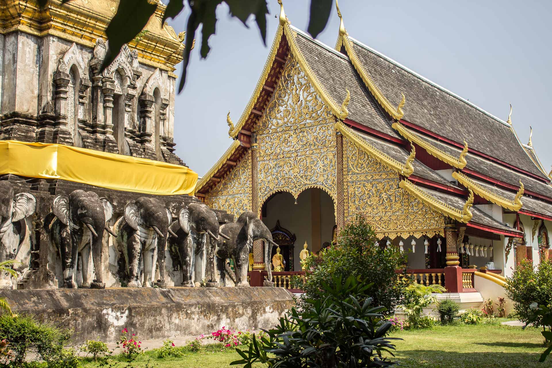Nouveau temple en vue : le Wat Chiang Mai et son « chedi » encerclé d’éléphants.