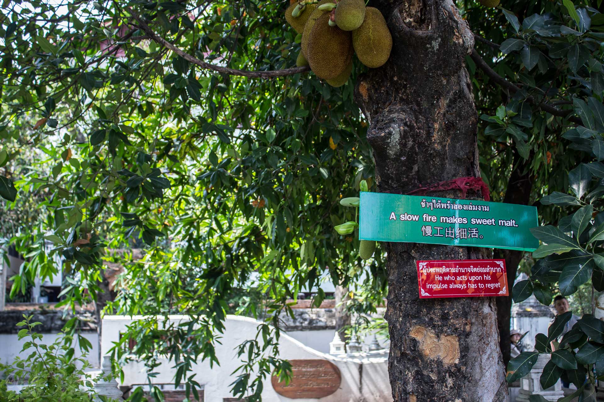 Ici aussi, on trouve ça et là diverses pancartes sur les arbres présentant des messages teintés de philosophie.