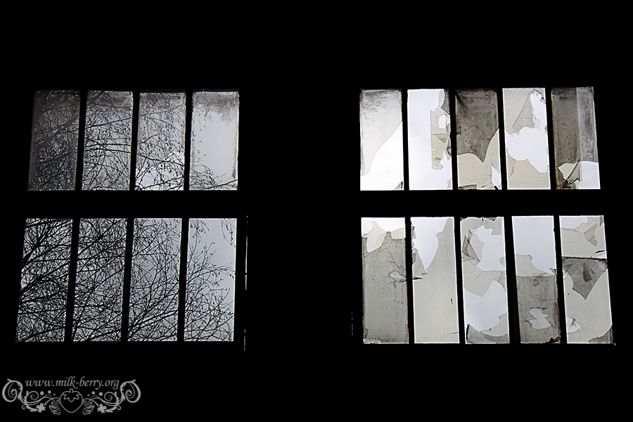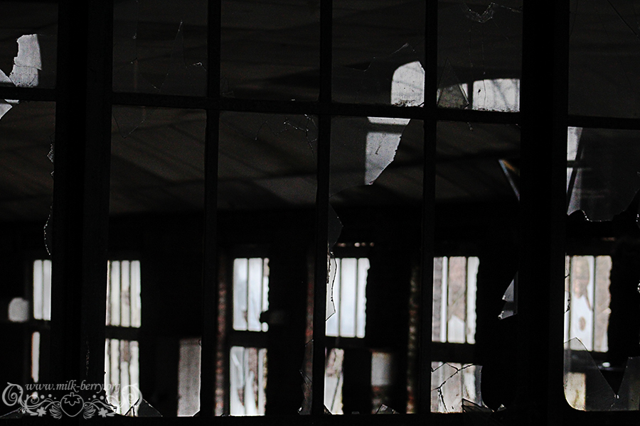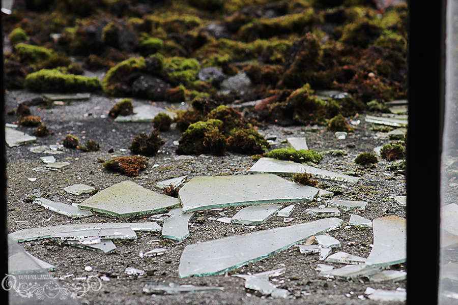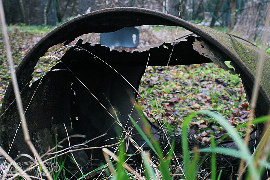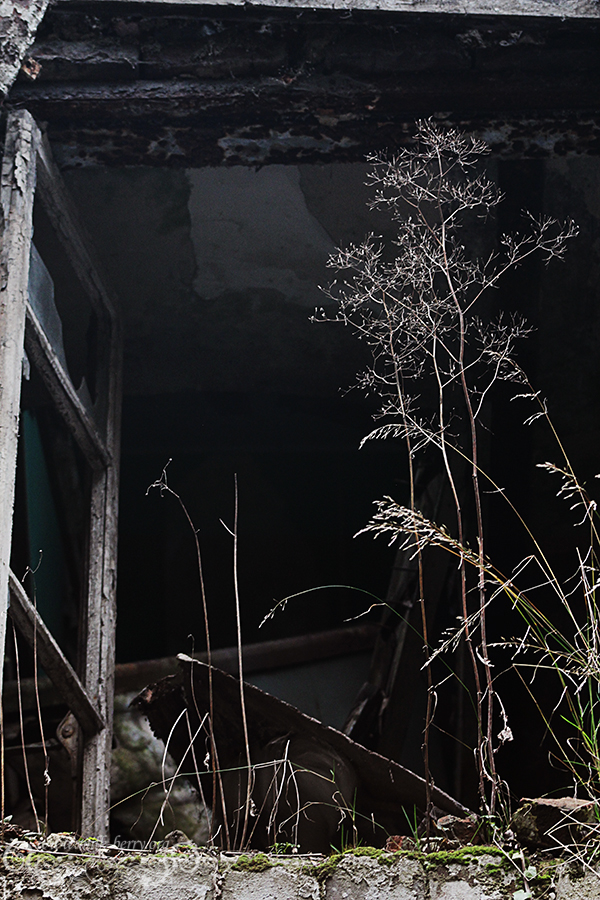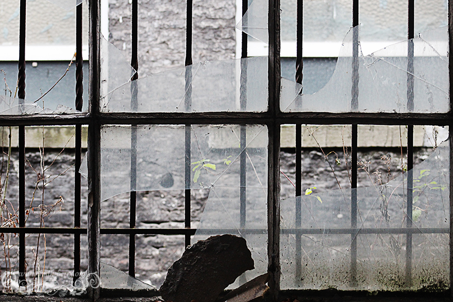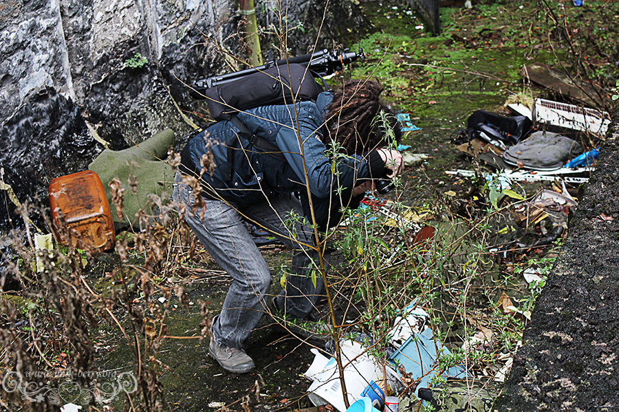 Arrivés sur place, nous faisons le tour du premier bâtiment qui s’offre à nous, plutôt vide et sans grand intérêt. On s’éloigne en direction d’une plate-forme surélevée qui pourrait nous permettre d’accéder aux autres bâtiments… Et là, grillés : un homme interpelle Lunie, qui lui répond assez froidement, pensant avoir à nouveau affaire à un voleur de ferraille. Manque de chance, il s’agit du gardien. On s’éloigne donc pour tenter de trouver une autre entrée, faisant le tour des bâtiments en les longeant (on peut constater leur état de délabrement assez avancé par la végétation qui a poussé aux étages et des traces d’incendie à certains endroits), pour finalement déboucher sur un bois… Pas la peine de continuer plus loin, on fait demi-tour et on choisit de pénétrer dans le seul autre bâtiment accessible, sans se soucier du fait que la fenêtre brisée par laquelle on rentre soit exposée sur des bâtiments habilités. Discrétion : zéro.