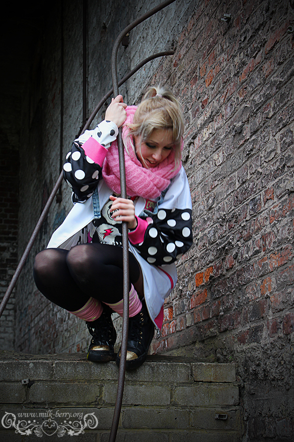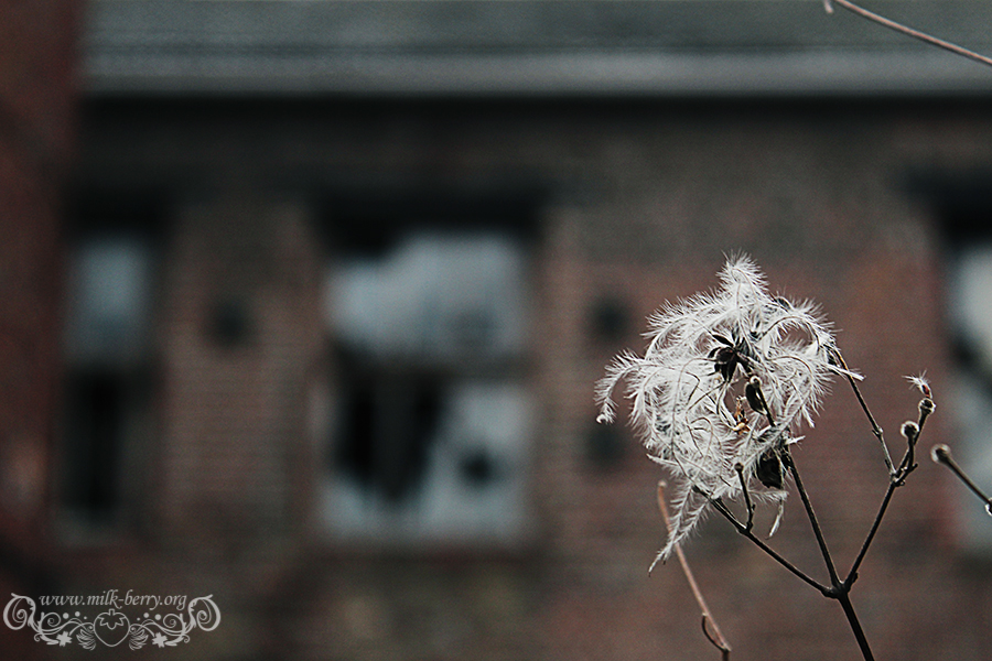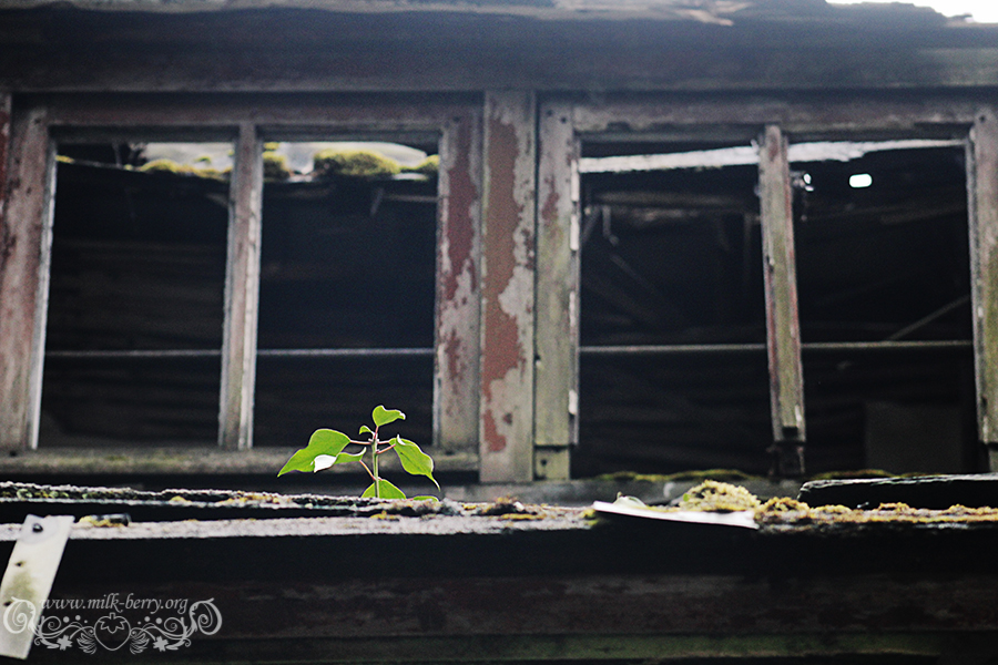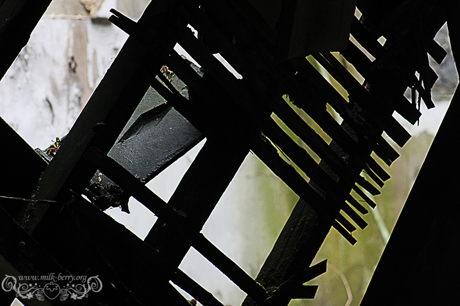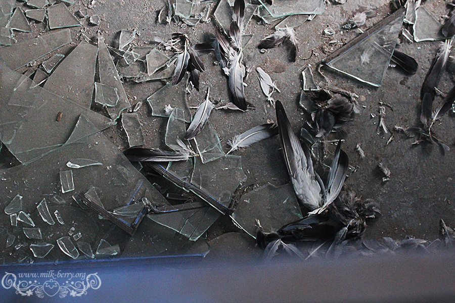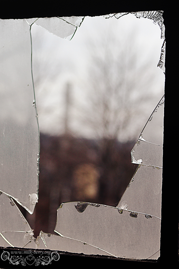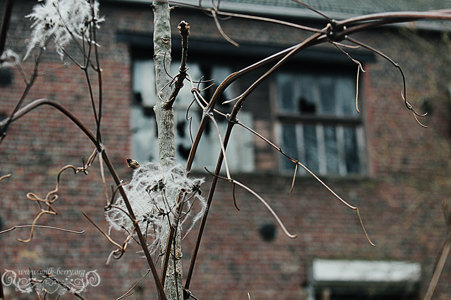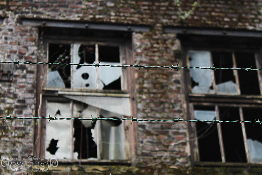 Arrivés sur place, nous faisons le tour du premier bâtiment qui s’offre à nous, plutôt vide et sans grand intérêt. On s’éloigne en direction d’une plate-forme surélevée qui pourrait nous permettre d’accéder aux autres bâtiments… Et là, grillés : un homme interpelle Lunie, qui lui répond assez froidement, pensant avoir à nouveau affaire à un voleur de ferraille. Manque de chance, il s’agit du gardien. On s’éloigne donc pour tenter de trouver une autre entrée, faisant le tour des bâtiments en les longeant (on peut constater leur état de délabrement assez avancé par la végétation qui a poussé aux étages et des traces d’incendie à certains endroits), pour finalement déboucher sur un bois… Pas la peine de continuer plus loin, on fait demi-tour et on choisit de pénétrer dans le seul autre bâtiment accessible, sans se soucier du fait que la fenêtre brisée par laquelle on rentre soit exposée sur des bâtiments habilités. Discrétion : zéro.