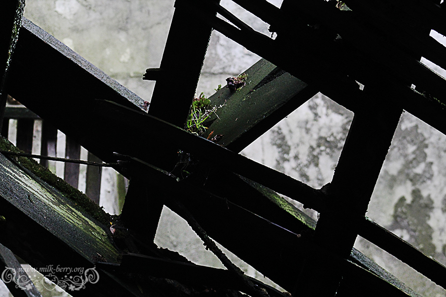 Plus grand chose d’intéressant non plus à voir à l’intérieur de celui-ci : quelques vestiges (chaises, ordinateur cassé, tas de vêtements humides dont un dans lequel des oiseaux ont fait leur nid, livre, tableaux…), sans plus. Après avoir tout visité, ce qui était plutôt rapide, on ressort pour tenter de faire le tour par l’autre côté. À nouveau, cela se solde par un échec, s’étant fait repérés au préalable, on préfère éviter de tenter une approche, d’autant que les bâtiments que l’on aperçoit semblent avoir leurs lumières allumées.