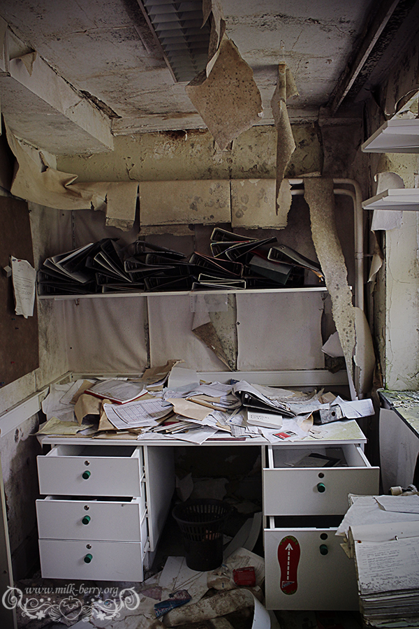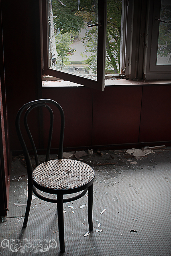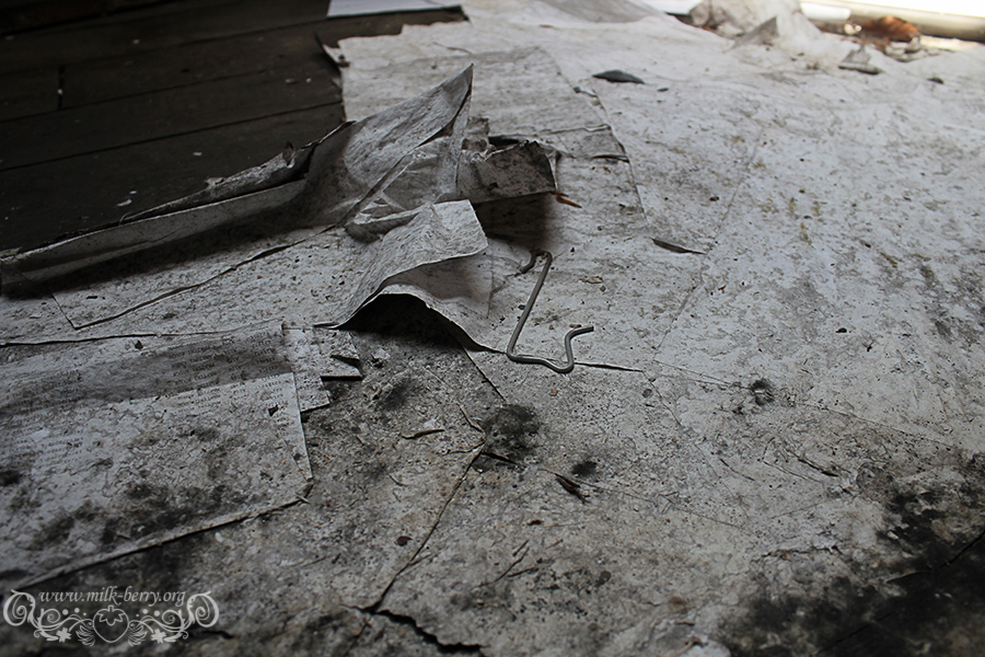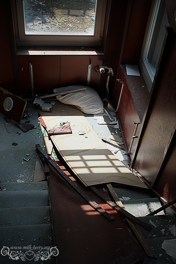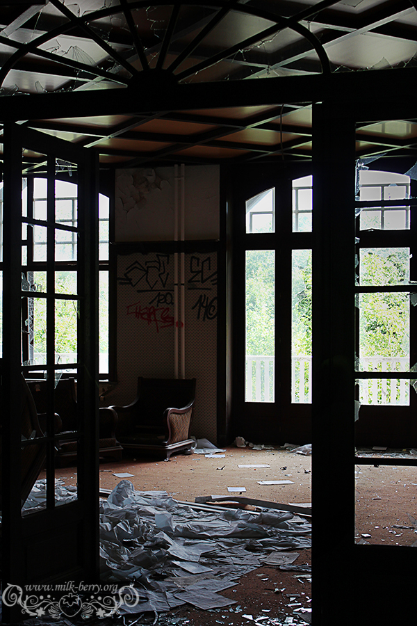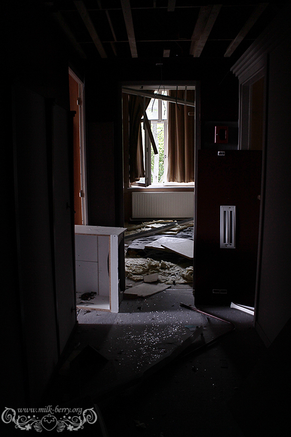 Notre visite se poursuit au travers des étages assombris avec le même goût amer qui reste coincé dans la gorge… Quel est donc l’intérêt de venir saccager un lieu à ce point ? Pourquoi ce besoin de tout casser, retourner, voler ? C’est dommage, car en-dehors de ses chambres assez répétitives et simples, l’hôtel en lui-même semblait avoir un certain caractère, entre son immense comptoir en bois qui accueille les visiteurs, ses jolis plafonds et ses petits balcons surplombant le paysage. Seule bonne surprise, les pièces dans les mansardes, qui étaient probablement réservées au personnel.