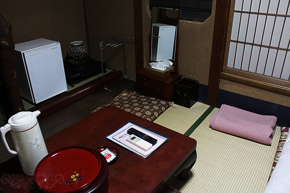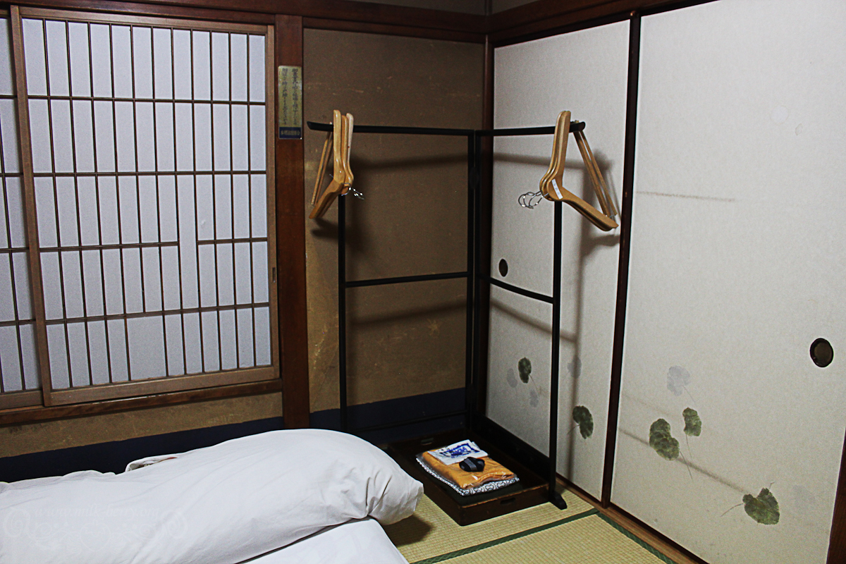 Le Tama Ryokan est une ancienne auberge de famille. Voyageant seule, j’étais dans la seule chambre « occidentale », qui était plutôt un mélange étrange entre tradition japonaise et style western. Je n’ai rien à redire dessus : cadre agréable, sanitaires propres, tout à disposition, et un lit comprenant un futon et une couette japonaise par-dessus le matelas occidental, qui fût probablement un des lits les plus confortables de toute ma vie. L’auberge est ouverte en permanence, la plupart des chambres n’ont pas de verrou.