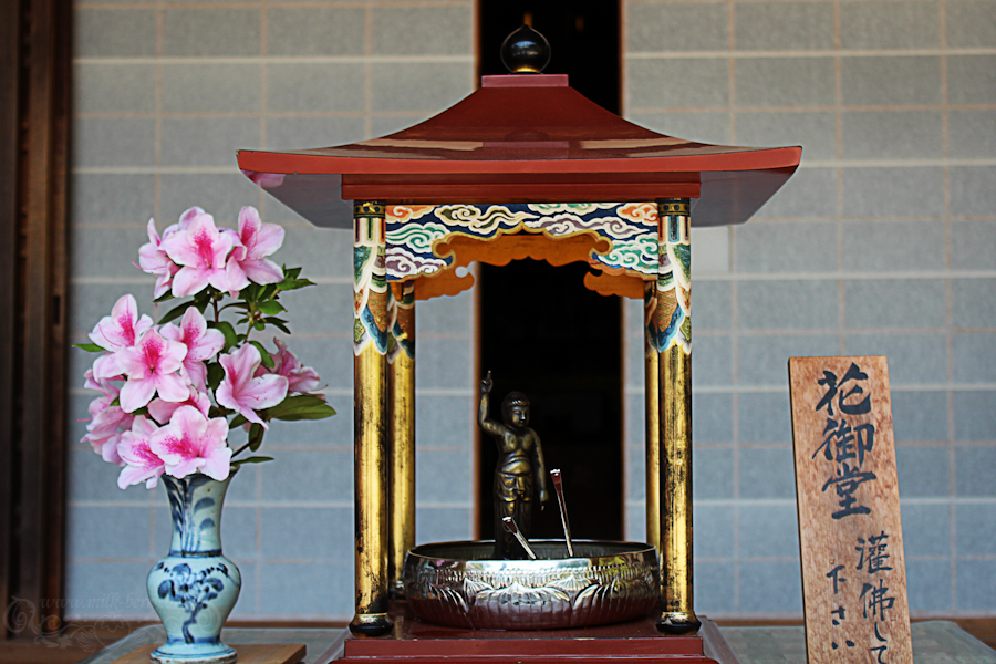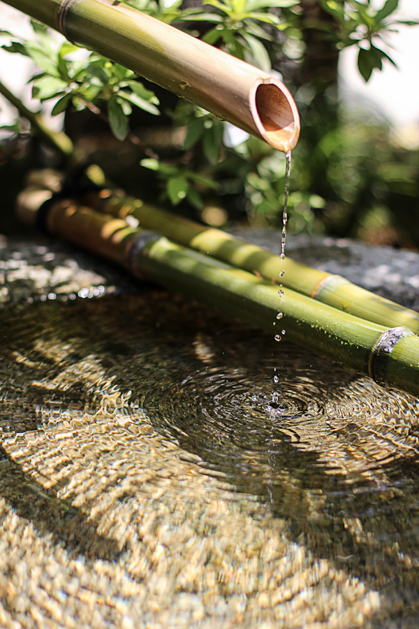 À l’entrée de chaque temple, on trouve toujours une petite fontaine d’eau (« mitarashi« ) pour se laver les mains et se purifier dans un rituel bien précis. On prend la louche de la main droite, on la remplit là où l’eau coule et on se lave la main gauche. Ensuite, l’inverse, on se lave la main droite avec la main gauche, et enfin, on verse de l’eau dans sa main gauche pour se rincer la bouche.