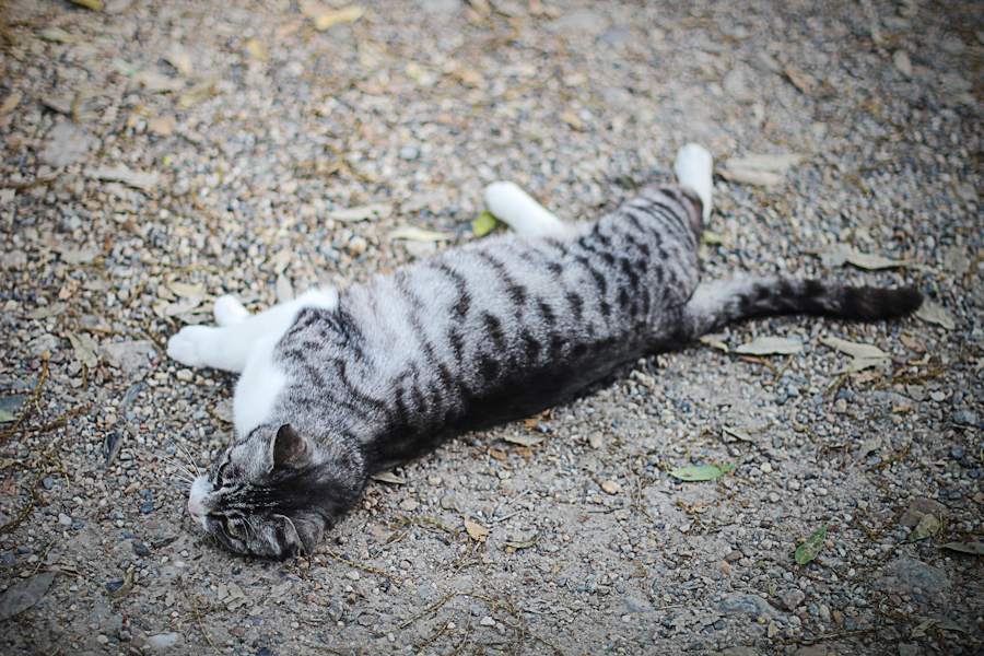 Je pense que de voir chaque jour des humains différents ramenant des odeurs extérieures, ça ne doit pas être des plus agréables pour les chats… Certains se laissent caresser, d’autres pas. Ils ne semblent pas être d’humeur « jouette » mais qu’importe, juste les observer dormir et se promener, c’est relaxant 🙂
