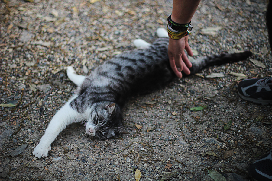 Tandis que nous faisions la chasse aux photos de chats, un moine est soudainement sorti du temple et a appelé l’un d’entre eux en le caressant, pour tenter de le faire sortir de l’enceinte tout en délicatesse, voulant sûrement éviter qu’il ne rentre dans le temple. Scène quelque peu incongrue mais tellement touchante…
