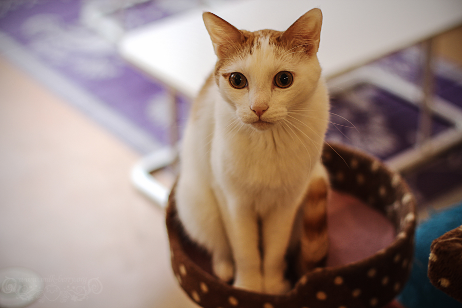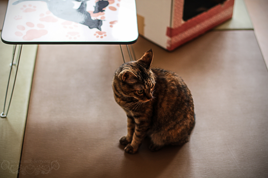 Enfin, à Tokyo, on aura quand même testé un « Neko Café« . Ne sachant pas où en trouver, je regarde vite-fait sur google où il y en a et on opte au hasard pour le « Nyafe Melange« . On prend la formule de 30 minutes (600Y), il y a des casiers pour laisser ses affaires et un petit règlement de « do and don’t », demandant bien aux visiteurs de ne rien faire qui puisse ennuyer les chats, et d’arrêter tout de suite si on fait quelque chose qui semble les ennuyer.