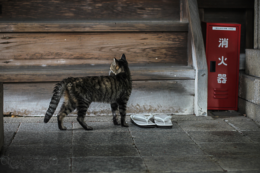 À Kyoto, j’ai parlé dans cet article d’un petit temple super mignon où nous nous sommes arrêté. Ce qui contribuait grandement à son charme, c’était surtout la présence de chats. J’ai d’abord remarqué le chat noir, avec lequel j’ai vainement joué à cache-cache sans parvenir à obtenir un cliché décent…