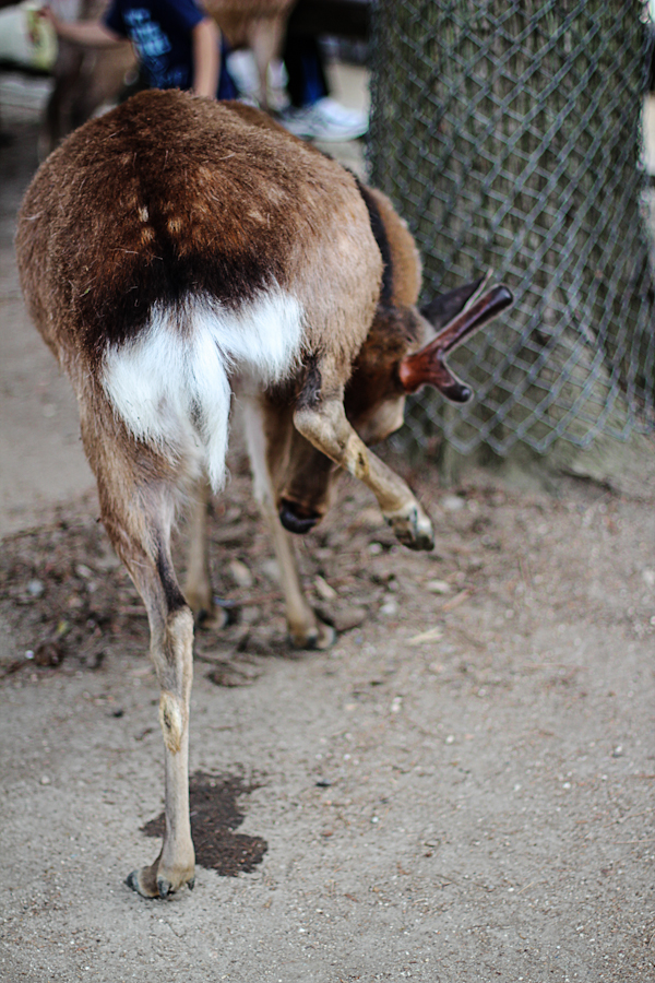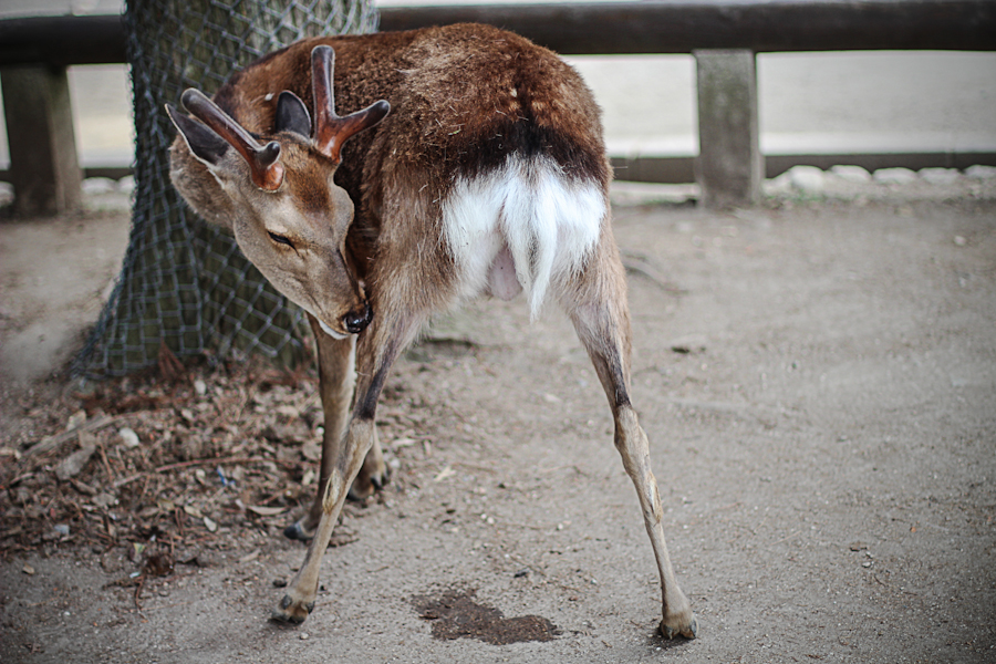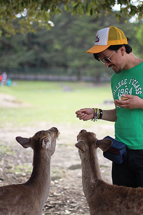 Enfin, on croise ce qui fait la particularité de Nara : les cerfs shika ♥ De fait, biches et cerfs sont partout en liberté, dans les parcs, sur les routes, on croise souvent de quoi acheter des crackers pour les nourrir. Habitués aux humains, on peut sans trop de problème les caresser.
