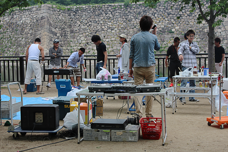 On se dirige vers le parc du château, ne sachant trop vers où aller. Il n’y avait pas trop de monde quand j’étais venue il y a 7 ans, mais aujourd’hui, une bonne surprise nous attend : nous sommes en pleine Golden week (semaine fériée au Japon), et l’on découvre le parc remplit de familles, groupes de jeunes et autres venus y faire un barbecue, s’amuser, pique-niquer, picoler. Enfants, jeunes, vieux se mêlent dans une ambiance festive, avec des musiques de ci de là. C’est assez impressionnant à voir – et ça nous donne envie d’être en été !