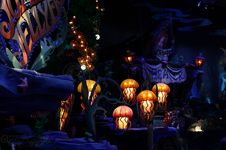 Nous voici plongés sous l’océan~♪ ! Les décors sont superbes et on a l’impression d’être immergés. J’adore les méduses ! Ceci dit, l’obscurité, le bruit et la musique qui va trop fort nous épuisent… Nous faisons tout de même le tour des attractions présentes, courtes mais amusantes, avant de ressortir à la lumière du jour.