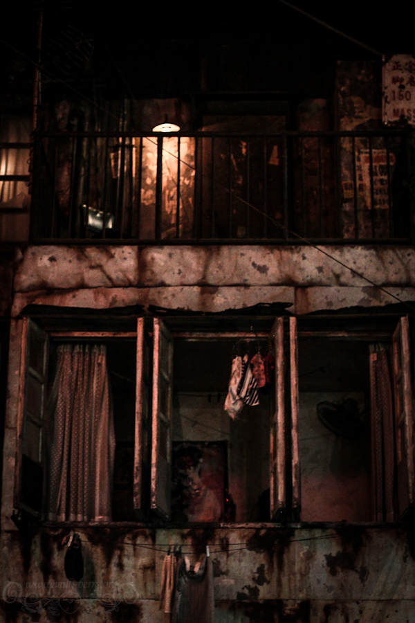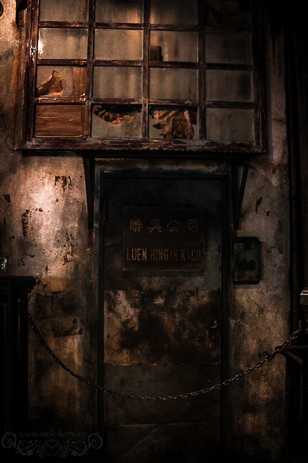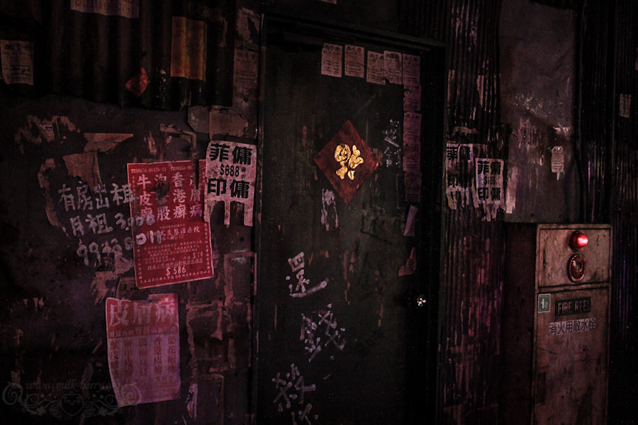 On décide d’emprunter l’ascenseur pour monter au 1e étage. Au fond de la salle, on peut effectivement y découvrir le fameux décor ! Pancartes en chinois, balcons, fausses plantes, faux appartements avec portes et fenêtre… On s’y croirait et on a presque l’impression d’être à nouveau en urbex 🙂