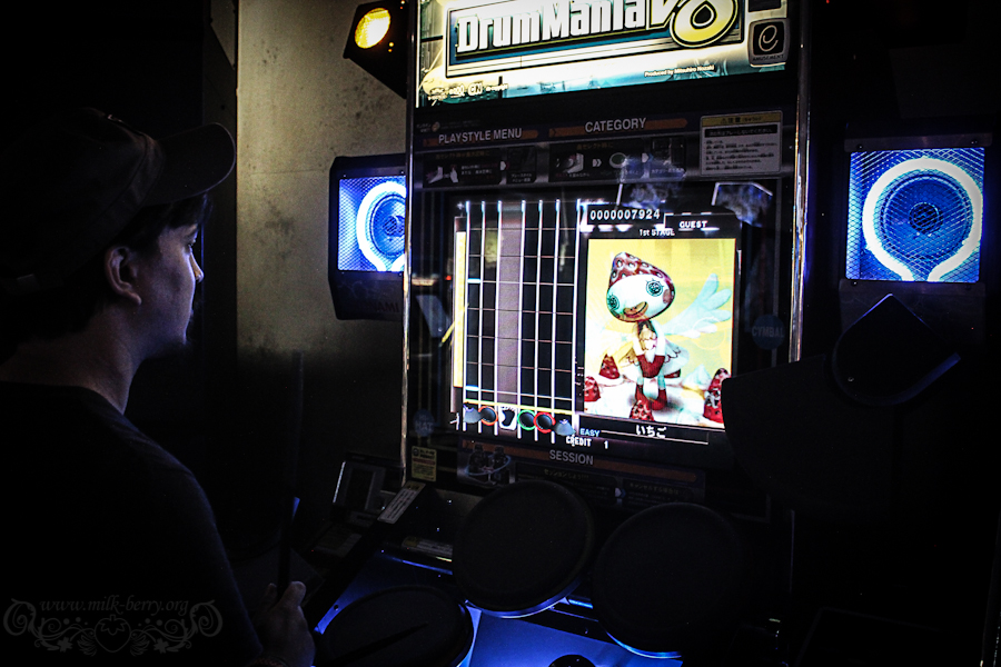 Vincent aura testé quelques jeux pendant que je sors prendre l’air et manger mon bentô, puis on se fait une petite partie de Mario Kart et enfin, de Silent Hill. Décor propice pour y jouer, d’autant que la borne est entourée d’un petit rideau à moitié déchiré pour plus d’immersion. La tension est à son comble et on finit par tomber à cours de monnaie. On aura également testé un obligatoire Dance Dance Revolution (en se sentant comme des merdes à foirer la moitié de nos pas tandis que sur la borne d’à côté les japonais gèrent), ainsi qu’une borne de batterie, ou Vincent a d’abord râlé parce qu’en mode facile c’était trop facile, puis râlé parce qu’en mode normal c’était impossible à suivre. Ah, les hommes :p J’ai également essayé et effectivement, pas moyen !