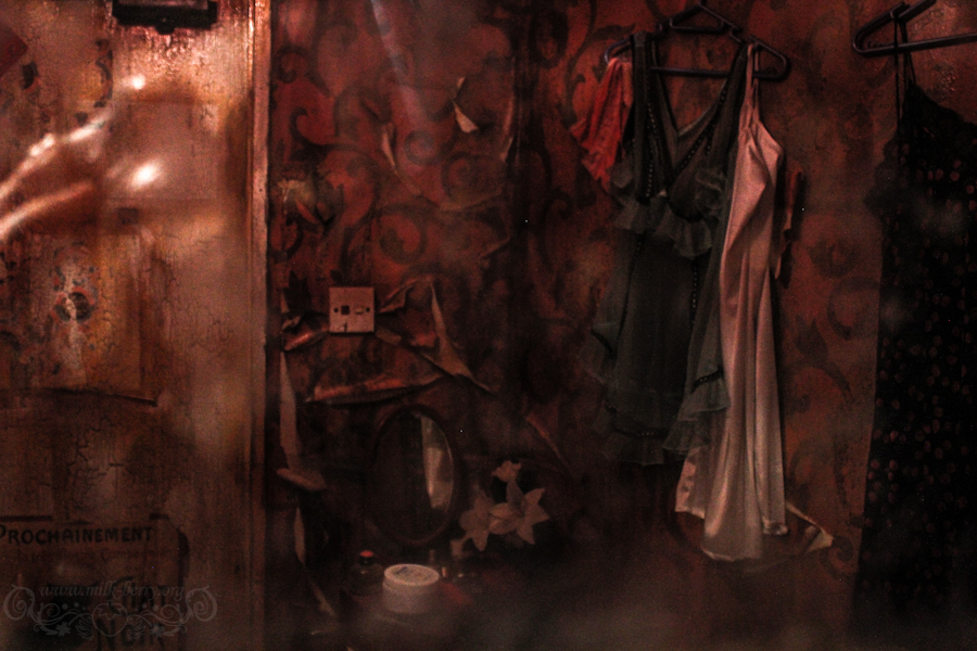 Quand on pénètre dans le bâtiment, des bruits de brouhaha se font entendre, comme si des gens parlaient et buvaient derrière les portes. En passant la tête par la fenêtre à notre droite, on peut y voir une reconstitution de chambre, avec une prostituée allongée sur un lit. (Bonus : une plaque Tournée du Chat Noir dans le décor ! Je ne l’ai remarquée qu’en traitant la photo !)