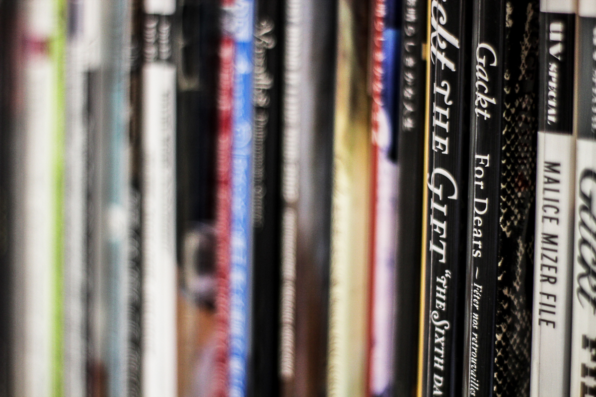 Ce qui m’intéresse, c’est le petit rayon caché non loin du comptoir rempli de vieux magazines de visual kei. Ça me rappelle avec nostalgie mon adolescence : Malice Mizer, Moi dix Mois, Gackt, L’arc~en~ciel, X Japan, hide, Luna Sea, Miyavi, … Et bien sûr Dir en grey. Il y a plein de photos de leurs jeunes années extravagantes, ainsi que des artbooks plus récents. Je me contente du bouquin sur The Unraveling, et je demande une photo à la vendeuse que je trouve juste trop mignonne ! Il n’y a pas d’âge pour garder une pointe d’excentricité ♥