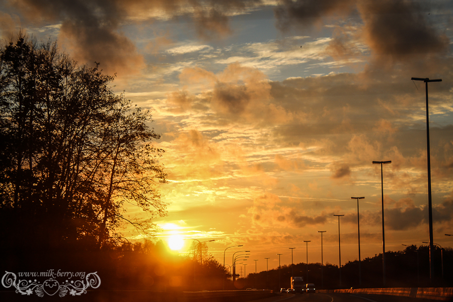 Et nous reprenons la route sous le soleil couchant, appréciant avec joie les couleurs orangées du ciel !