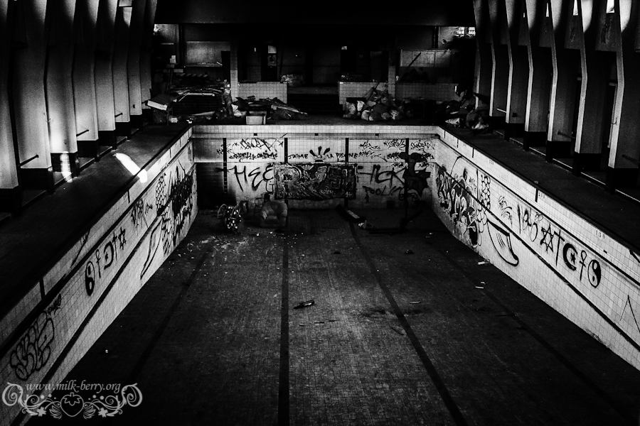 Si les étages sont relativement vides, le rez-de-chaussée, en revanche, nous offre la découverte de l’ancienne piscine, toujours présente et intacte bien que malheureusement couverte de tags ! Les fenêtres étant cloîtrées, il fait relativement sombre, difficile de prendre une photo correcte. Les pièces avoisinantes sont également remplies de documents d’époque, de meubles et autres merveilles. On fouille un peu par curiosité, sans pouvoir prendre de photo du fait du manque de lumière.