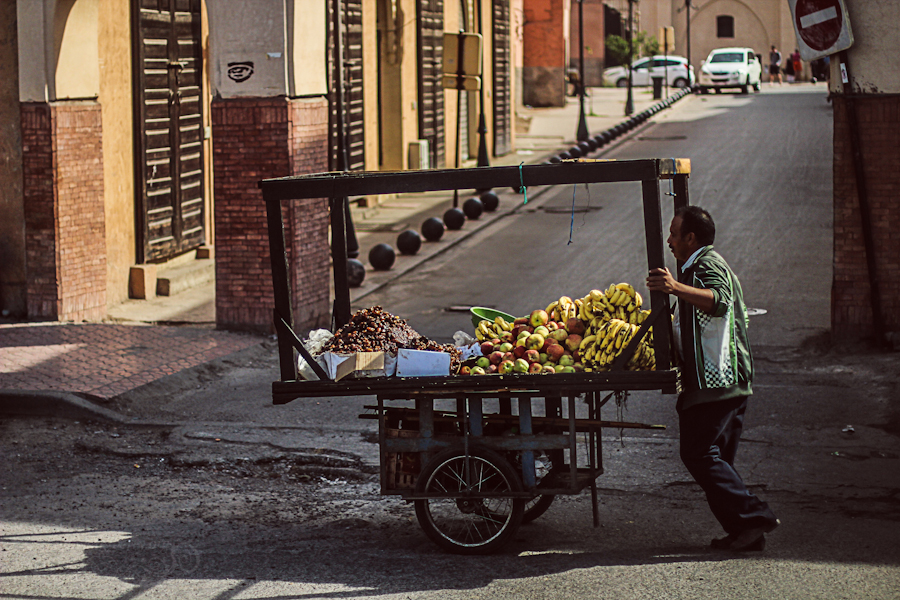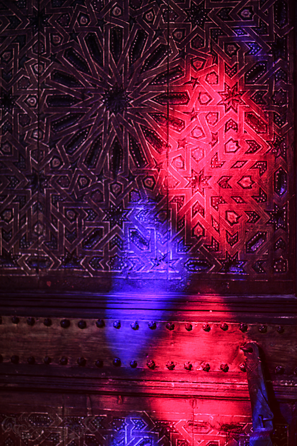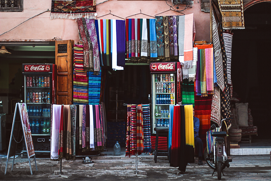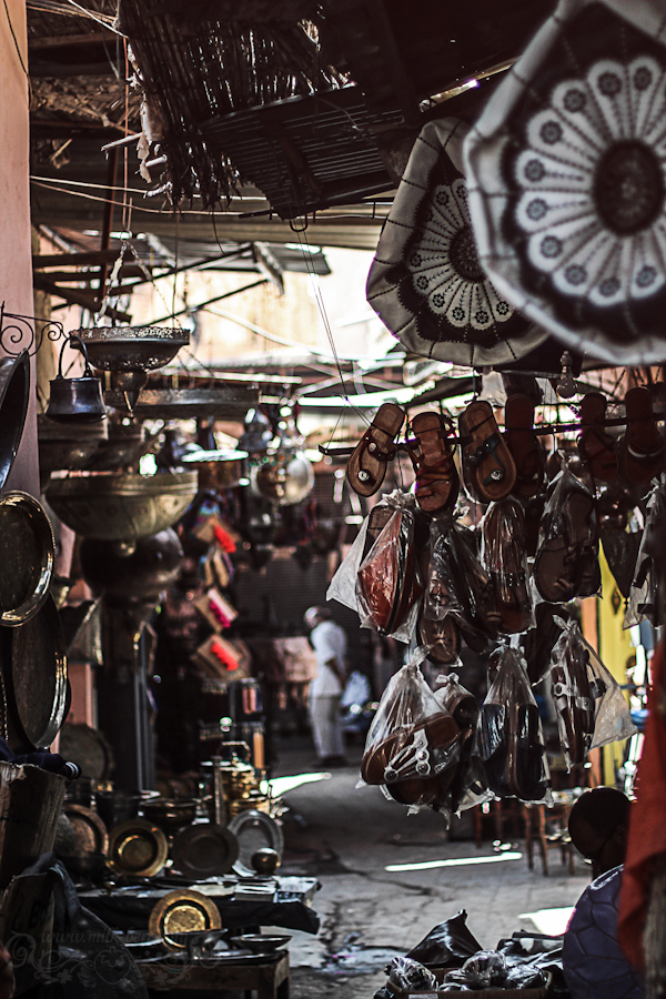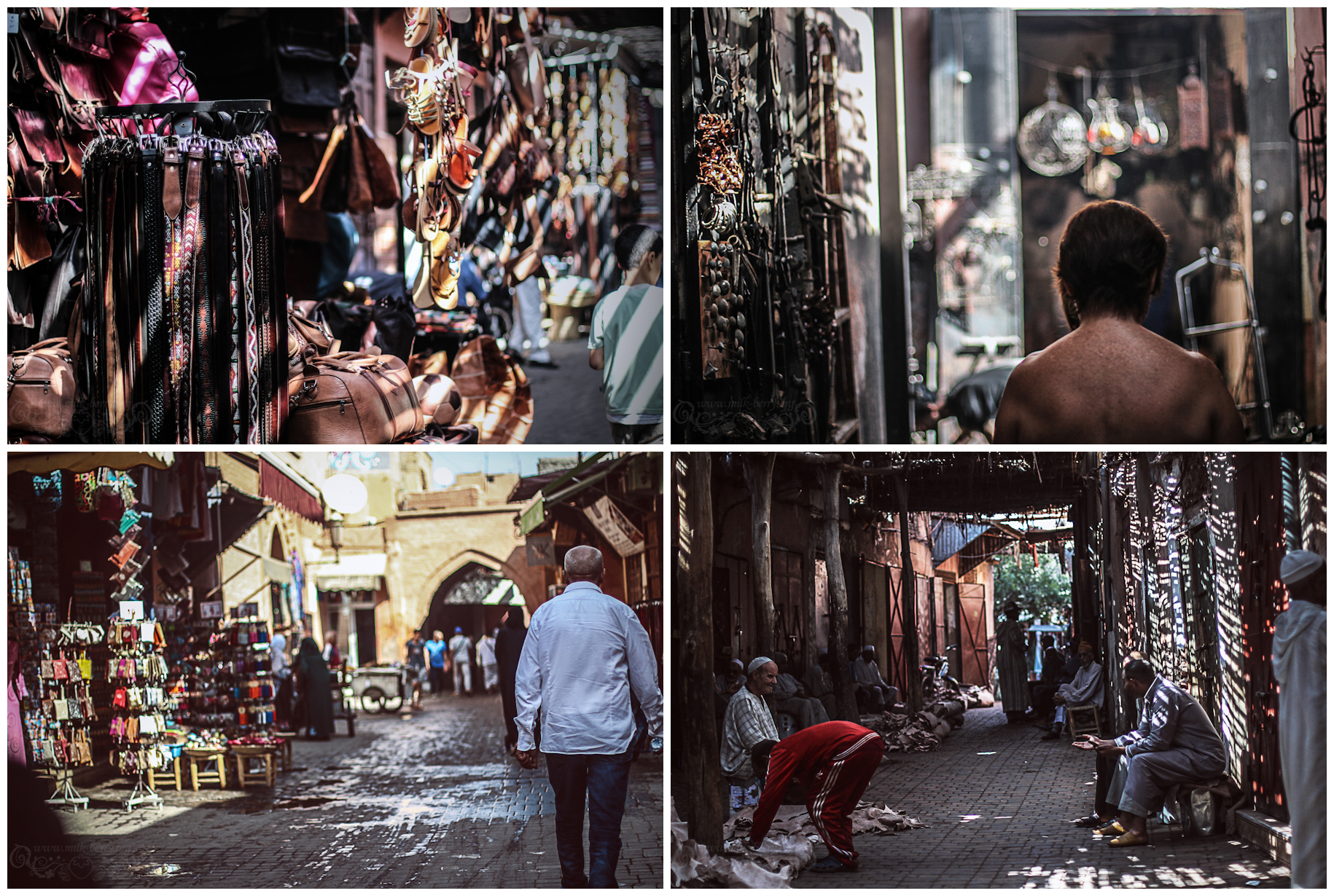 Entre deux visites, les guides nous présentent Marrakech dite « la Ville rouge« , ainsi surnommée pour la couleur ocre de ses murs. Ils nous mènent dans le dédale des souks, où les artisans exposent leurs objets divers. Métallurgie, instruments, vêtements, bijoux… Le choix est vaste ! Nous avions été avertis que prendre des photos des vendeurs dans les souks pouvaient attirer des ennuis, j’ai donc préféré ne pas trop sortir mon appareil pour m’éviter tout courroux. Certains témoignages décrivait les souks comme un lieu où l’on se fait durement harceler pour les ventes, mais nous n’avons pas ressenti ça, sûrement parce que nous les traversions avec un guide sans nous attarder.