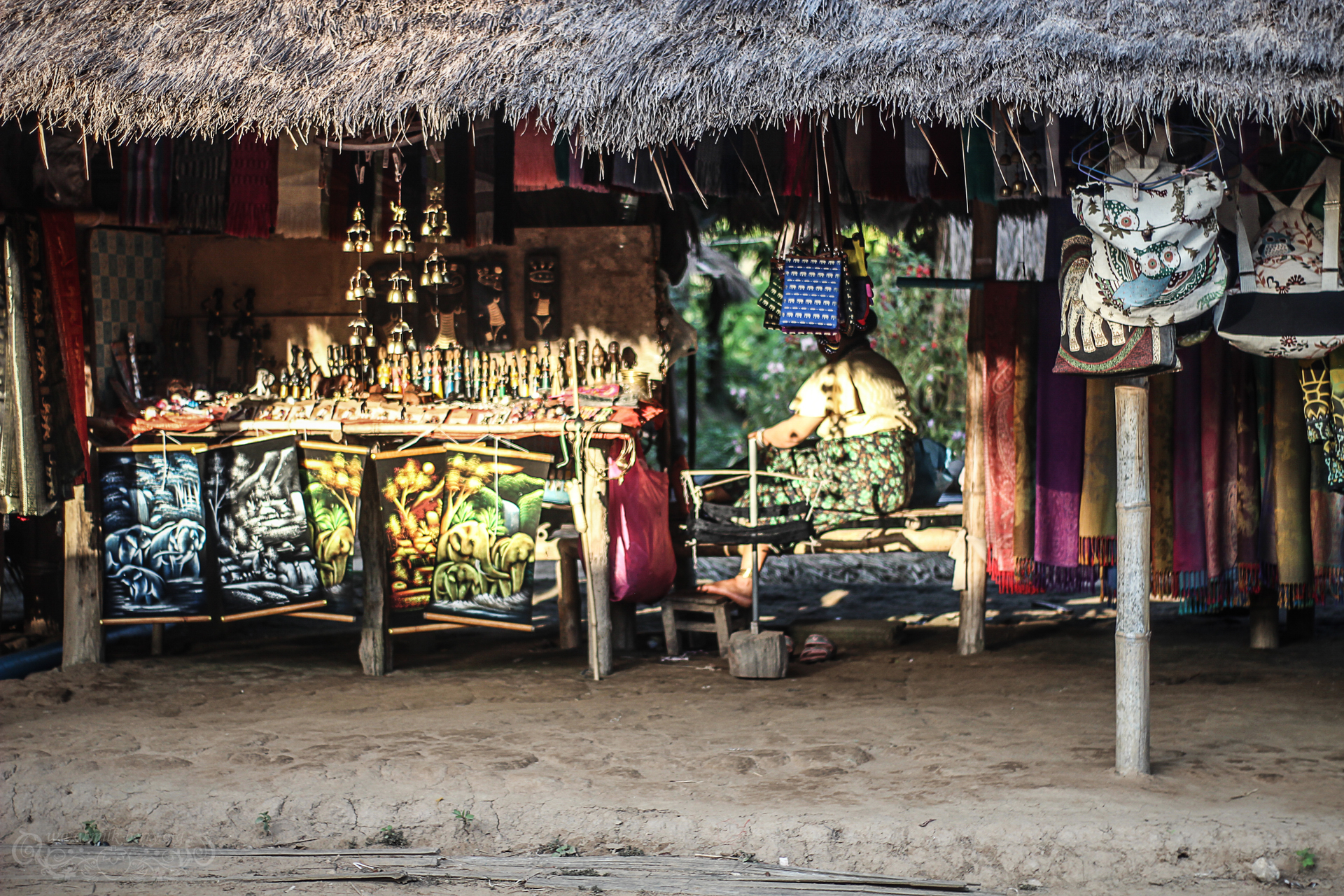 Quand la guide discute avec l’une de ces femmes, on peut la voir esquisser un sourire. Je me promène parmi les stands de vente, elles vaquent à leurs activités, et me sourient lorsque je passe devant elle. À l’arrière des paillotes, on peut apercevoir leurs habitations.