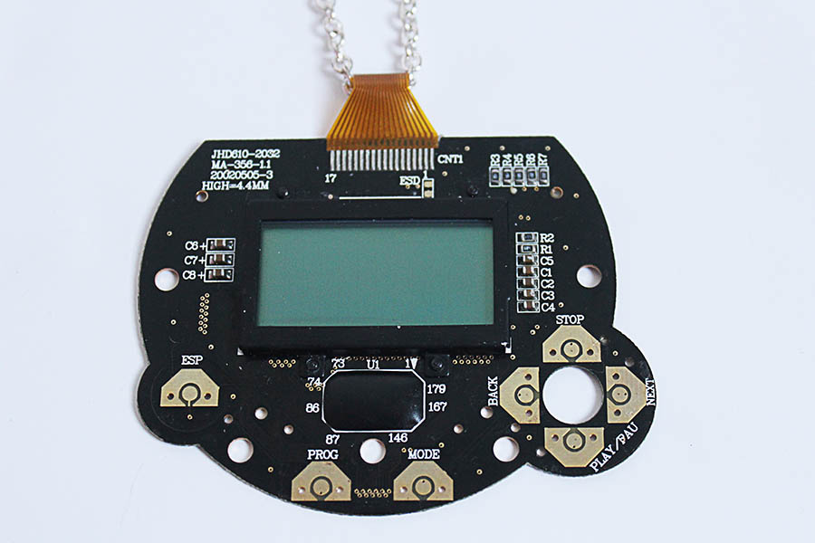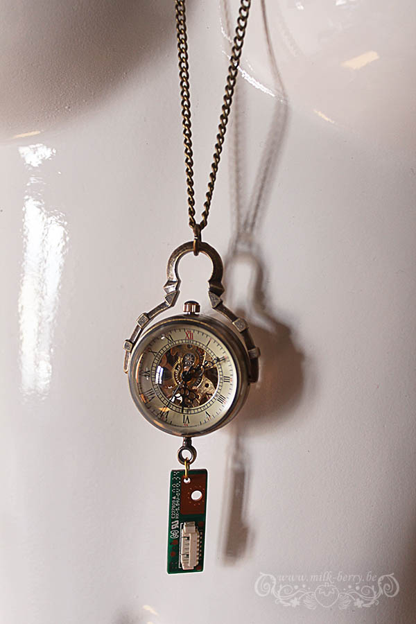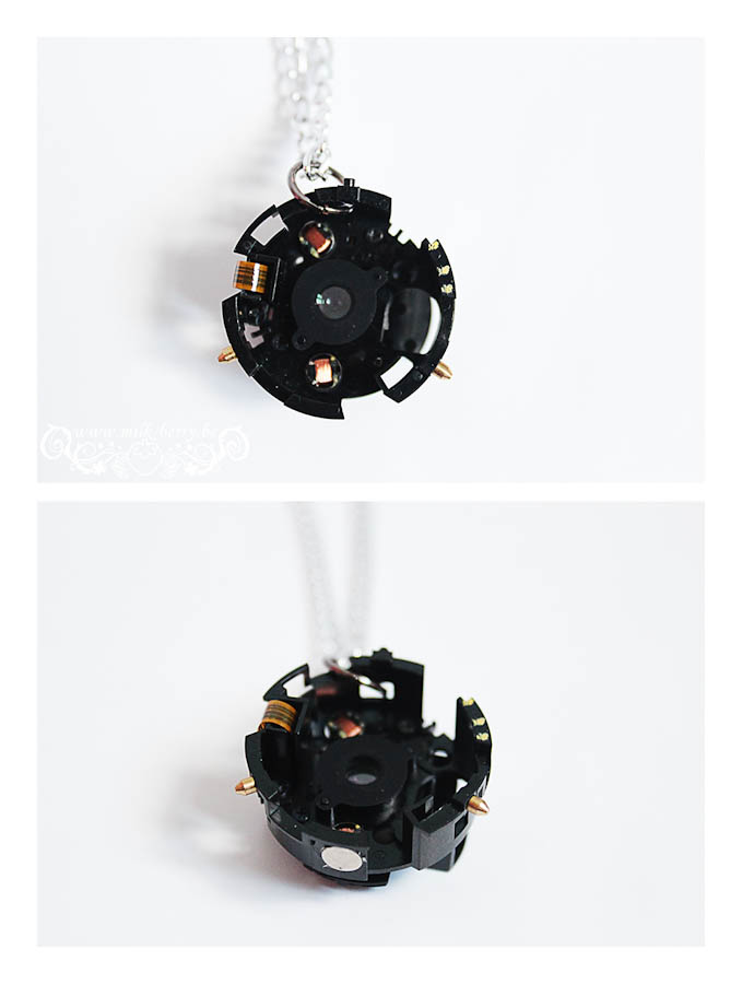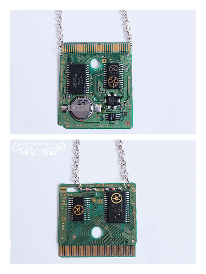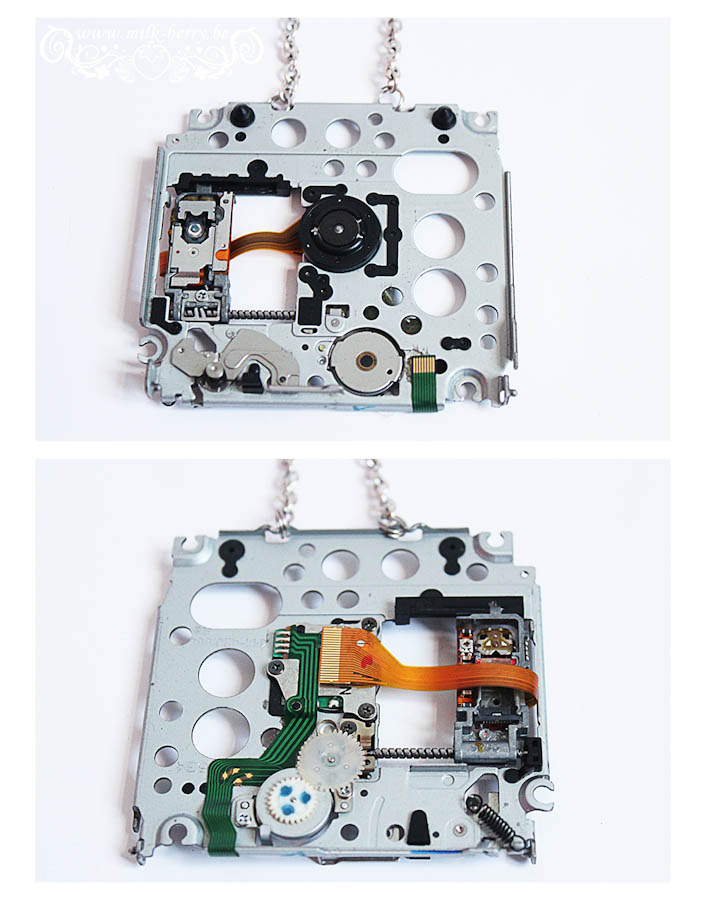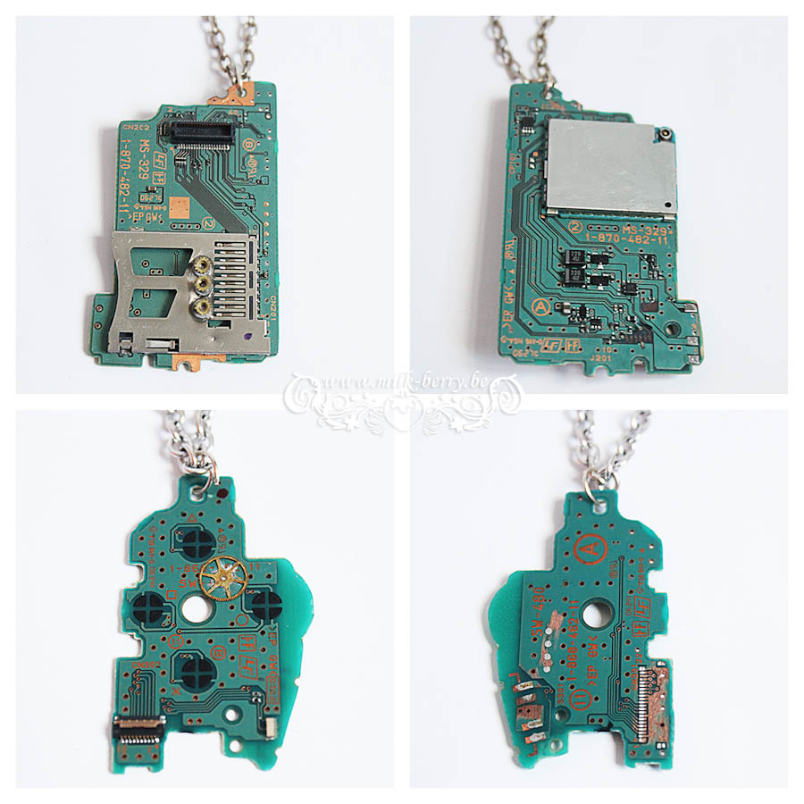 Colliers réalisés avec les pièces (customisées) de divers appareils : PSP, Walkman, Appareils photo. Les circuits sont poncés et vernis.