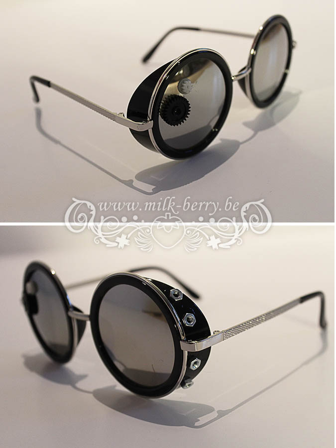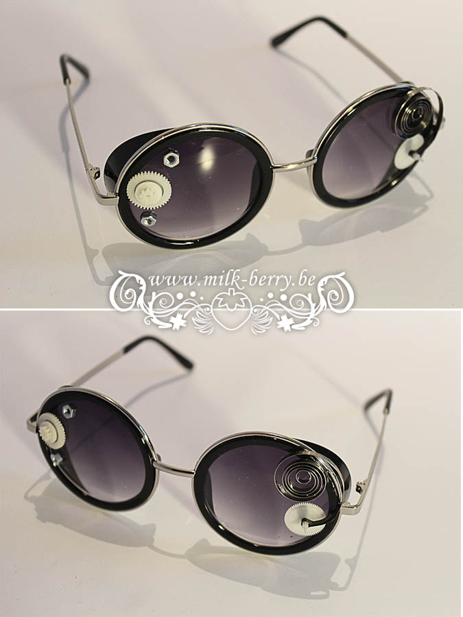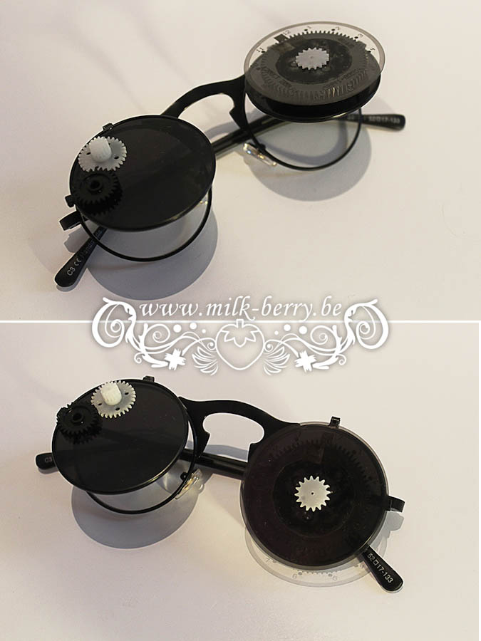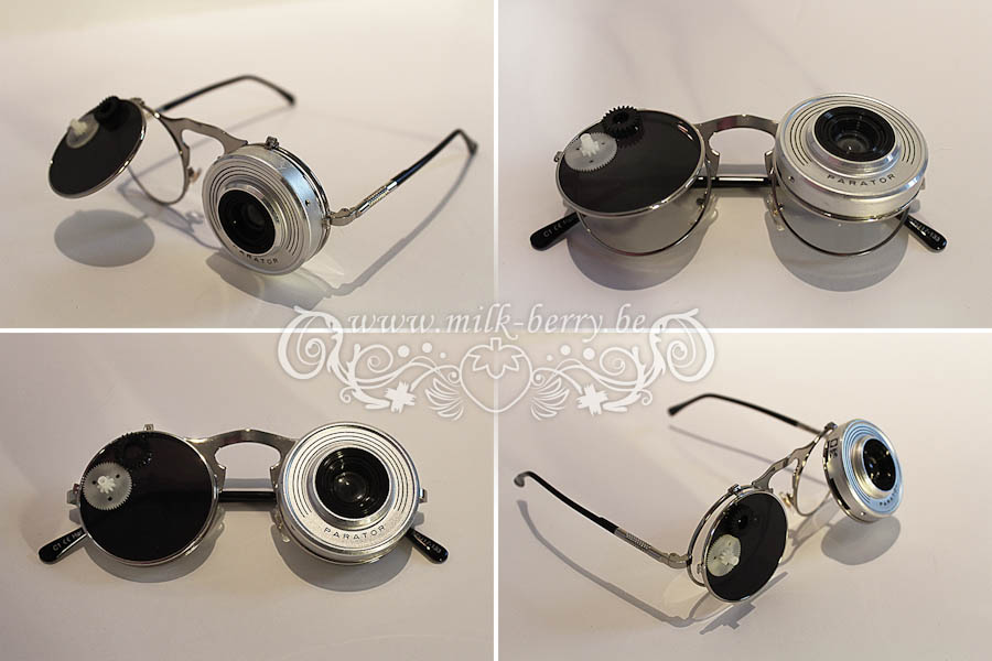 Les paires de lunettes ont été réalisées avec des éléments de récupération : rouages en plastique, objectif d’appareil photo, boulons et autres.