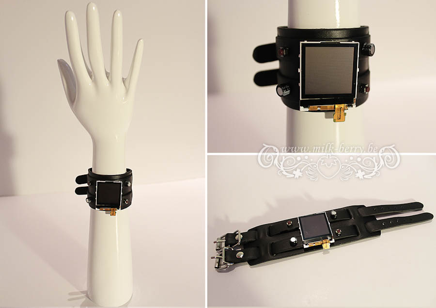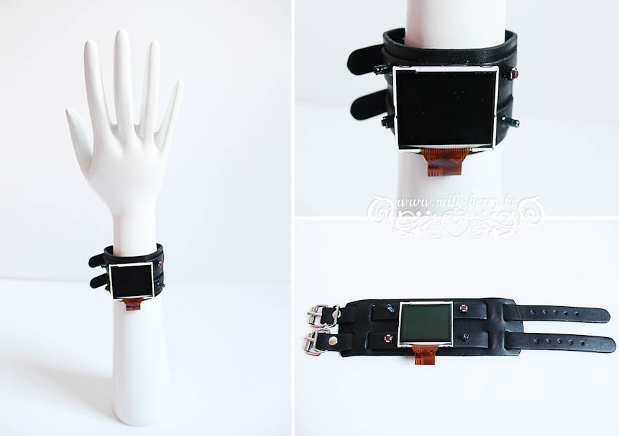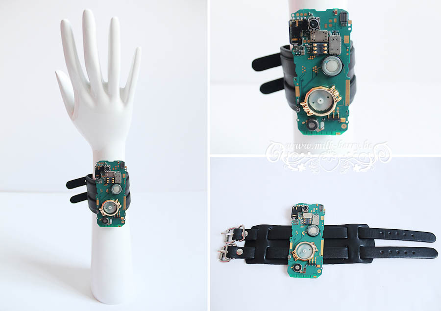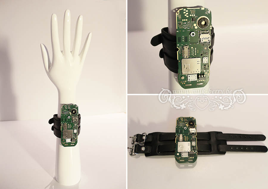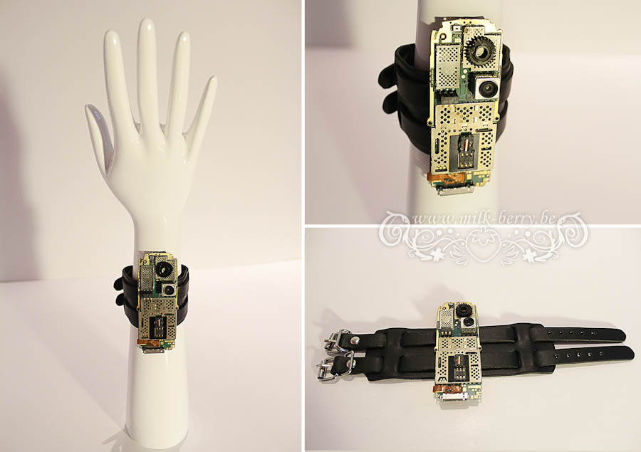 Ces bracelets futuristes ont été réalisés avec les cadavres de vieux GSM (qui ont été poncés et customisés) et leurs écrans. Fun : les petits boutons rouges présents sur certains bracelets sont cliquables !