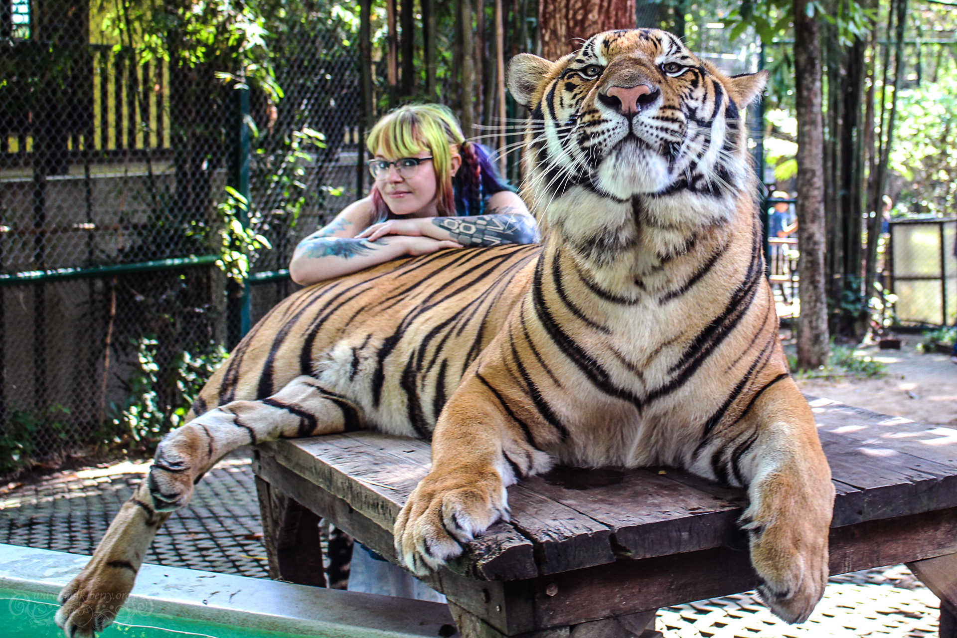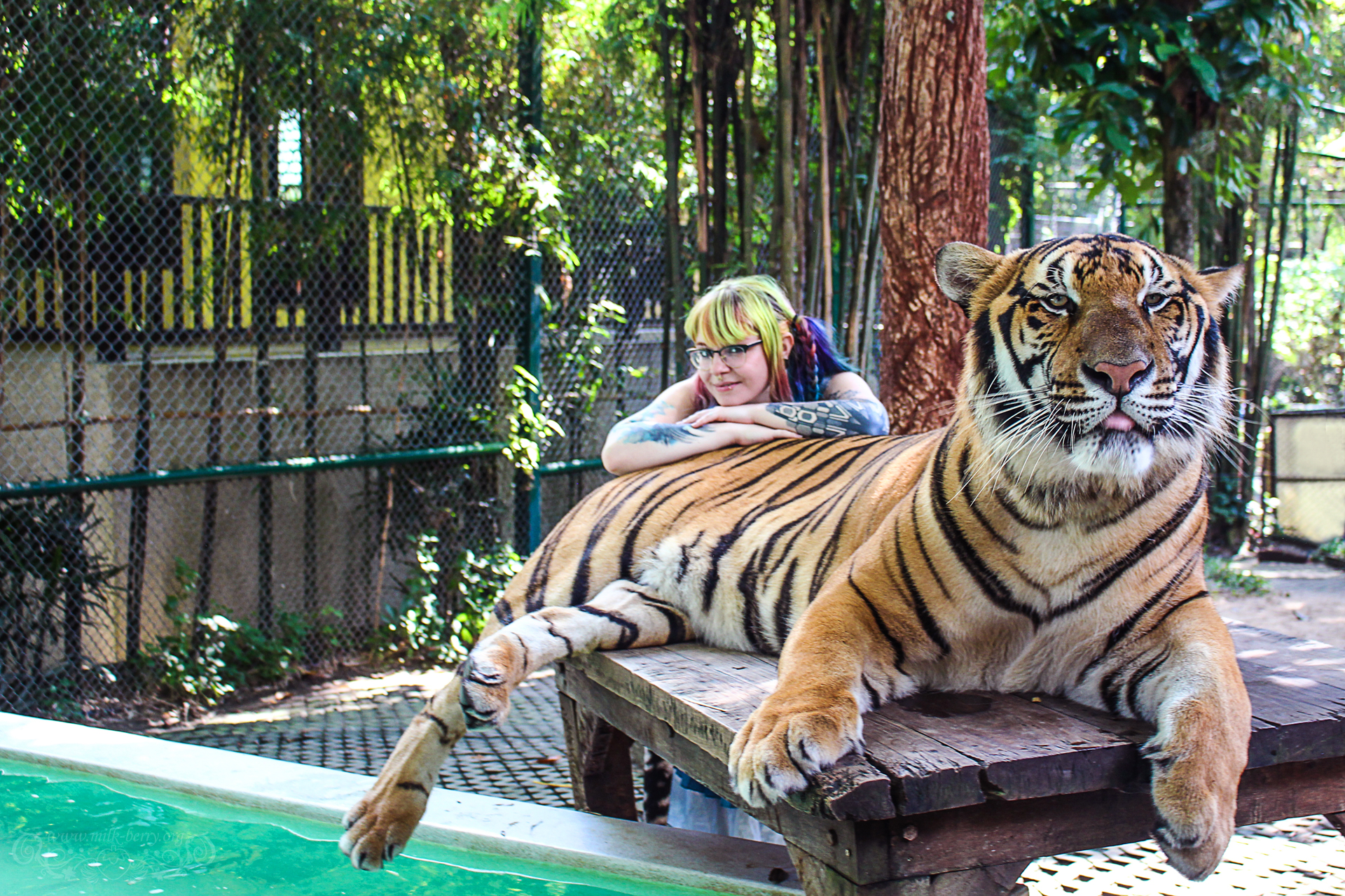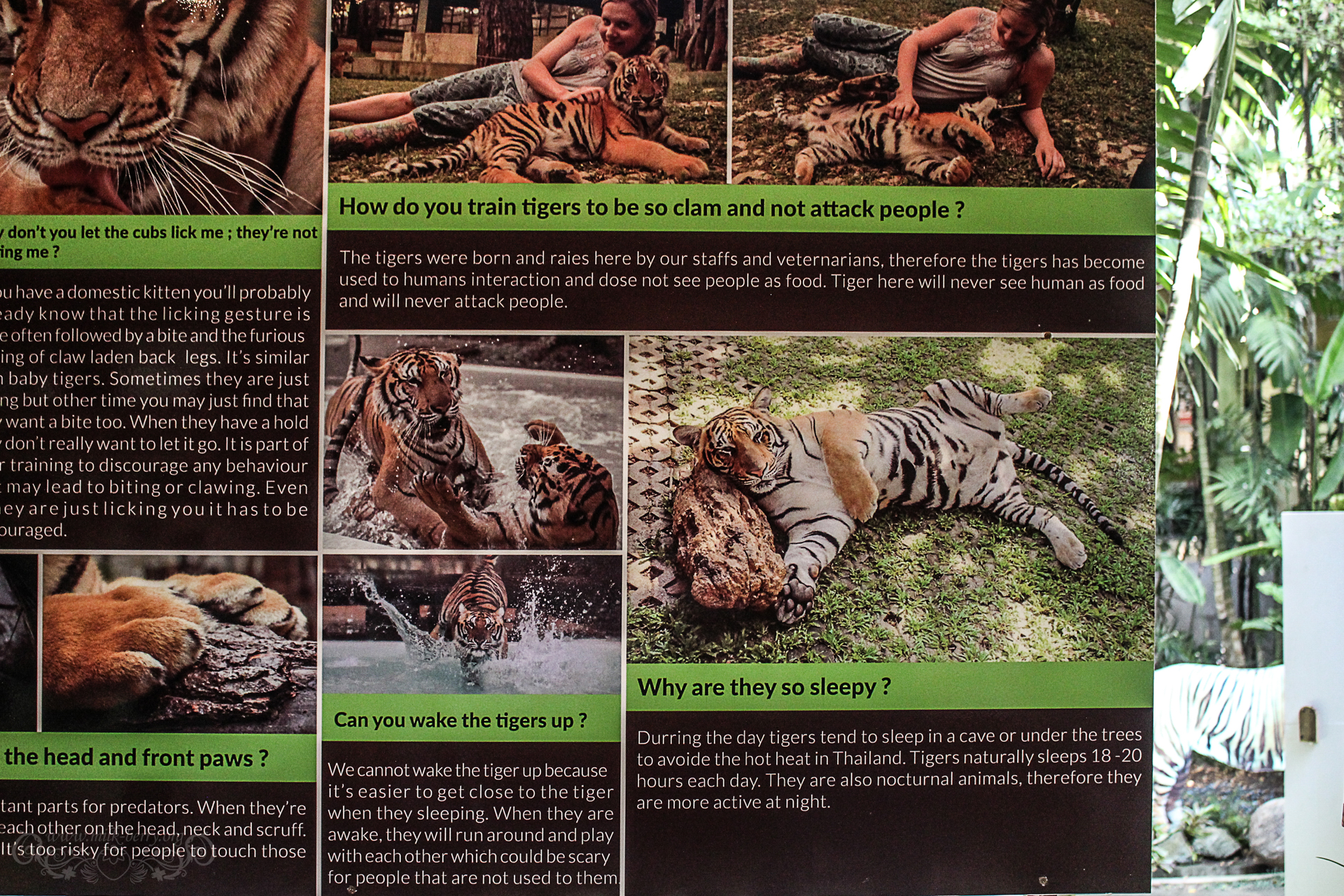 J’avais effectivement lu pas mal d’articles concernant le « Tiger Temple », un temple tenu par des moines bouddhistes où il était possible de se photographier en compagnie des tigres… Qui étaient attachés par des chaînes et drogués. À la suite d’investigations, une descente des autorités a été réalisée et les cadavres d’une 40aine (!!!) de bébés tigres ont été retrouvés dans des congélateurs. Non seulement nos séduisants moinillons droguaient les tigres pour profiter du tourisme, mais en plus, ils effectuaient un trafic – il faut savoir que les tigres, leur peau, leurs dents, leurs griffes et leurs organes se revendent cher sur le marché noir. Après cela, le temple a bien entendu fermé ses portes définitivement.