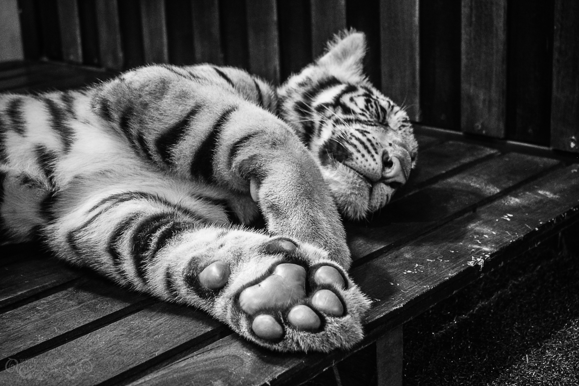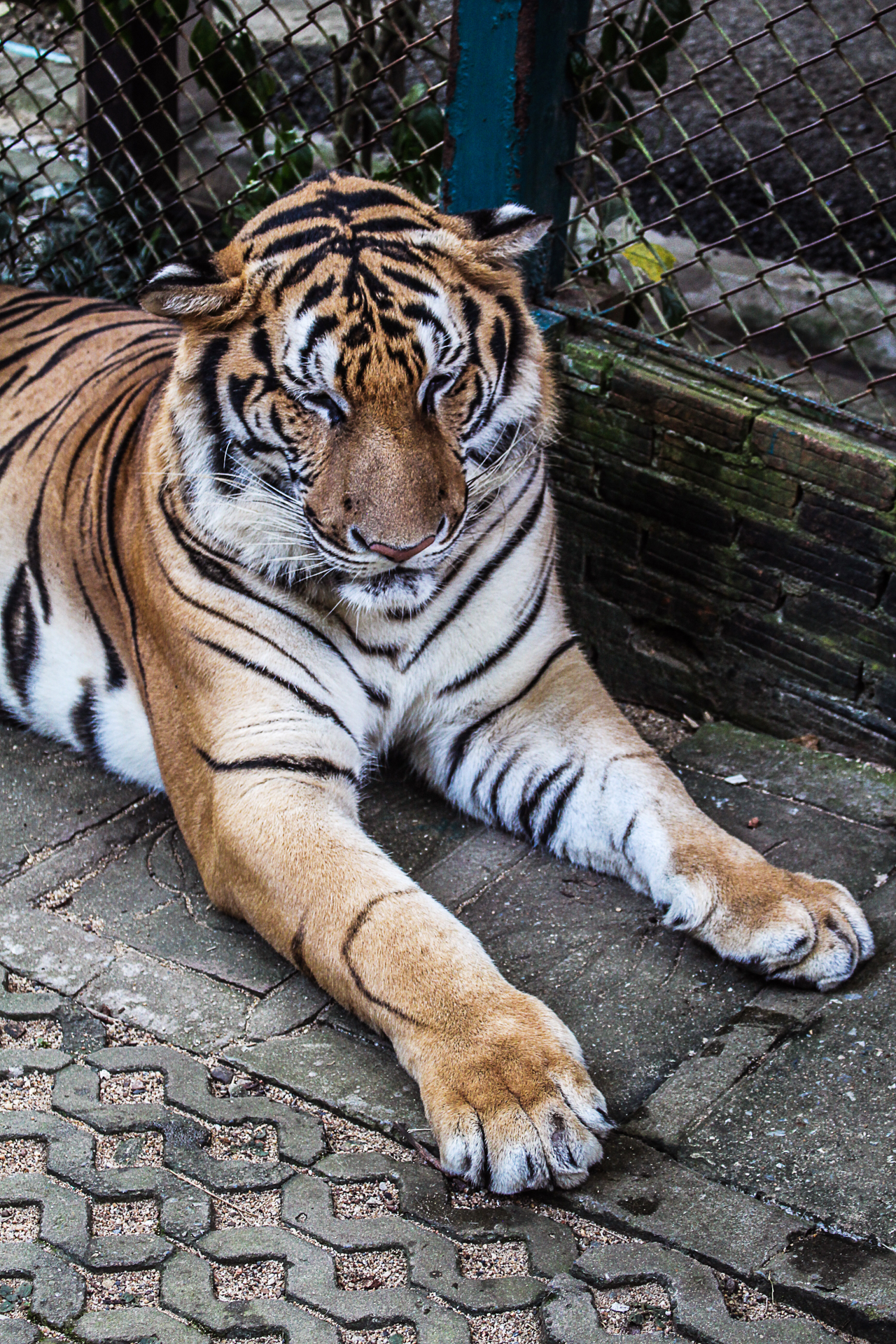Alors au final, drogués ou pas drogués ? N’étant pas spécialistes des animaux, c’est difficile à dire. Mon compagnon a calculé le pouls des tigres que nous avons vu, celui des jeunes tigres du Bengale était beaucoup plus rapide que celui des adultes, ce qui est plutôt normal. Du reste… Allez savoir. En dehors du fait qu’être confrontés aux visites d’humains et qu’être enfermés dans des petits enclos n’est certes pas l’idéal pour eux, ils ne semblaient pas être maltraités, on aurait juste dit des gros chats tantôt joueurs, tantôt endormis. Les éleveurs ont effectivement des bâtons sur eux, mais pas pour les frapper : quand un tigre tourne sa tête, ils accrochent juste un morceau de viande sur le bâton et le tendent au tigre pour qu’il regarde dans la direction de l’appareil. J’avais bien envie de leur dire que je m’en fiche que le tigre regarde ou non et qu’ils peuvent lui foutre la paix, mais je suppose que les chatons ne sont pas contre une petite friandise