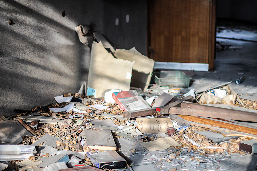 On est toujours aussi impressionnés par la quantité de matériel qu’il reste sur place. Les tableaux, le matériel, les ordinateurs (bien sûr tous explosés), les manuels, des vieilles télé retro et divers matériel de démonstration pour les cours mécaniques. Ca laisse rêveur !