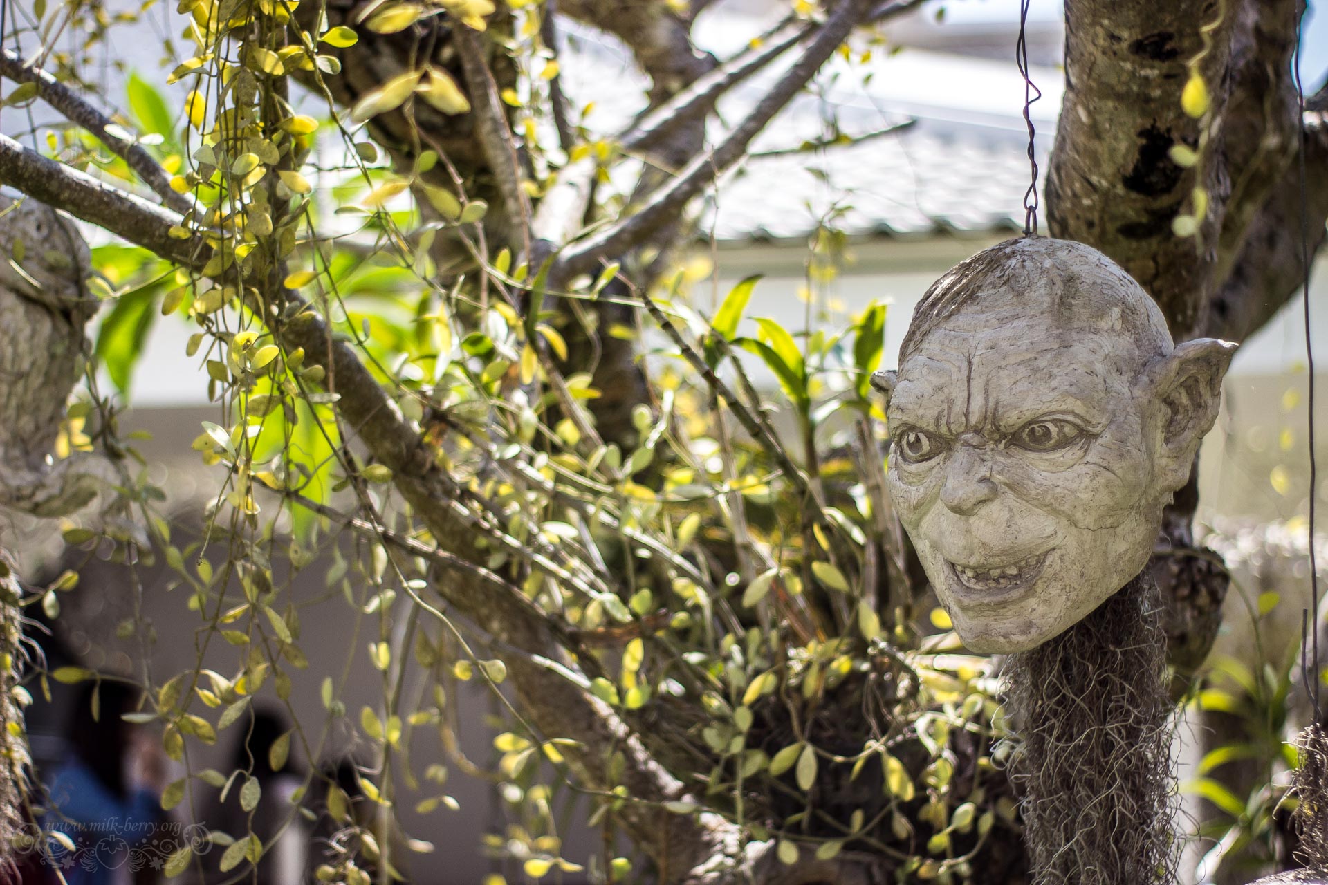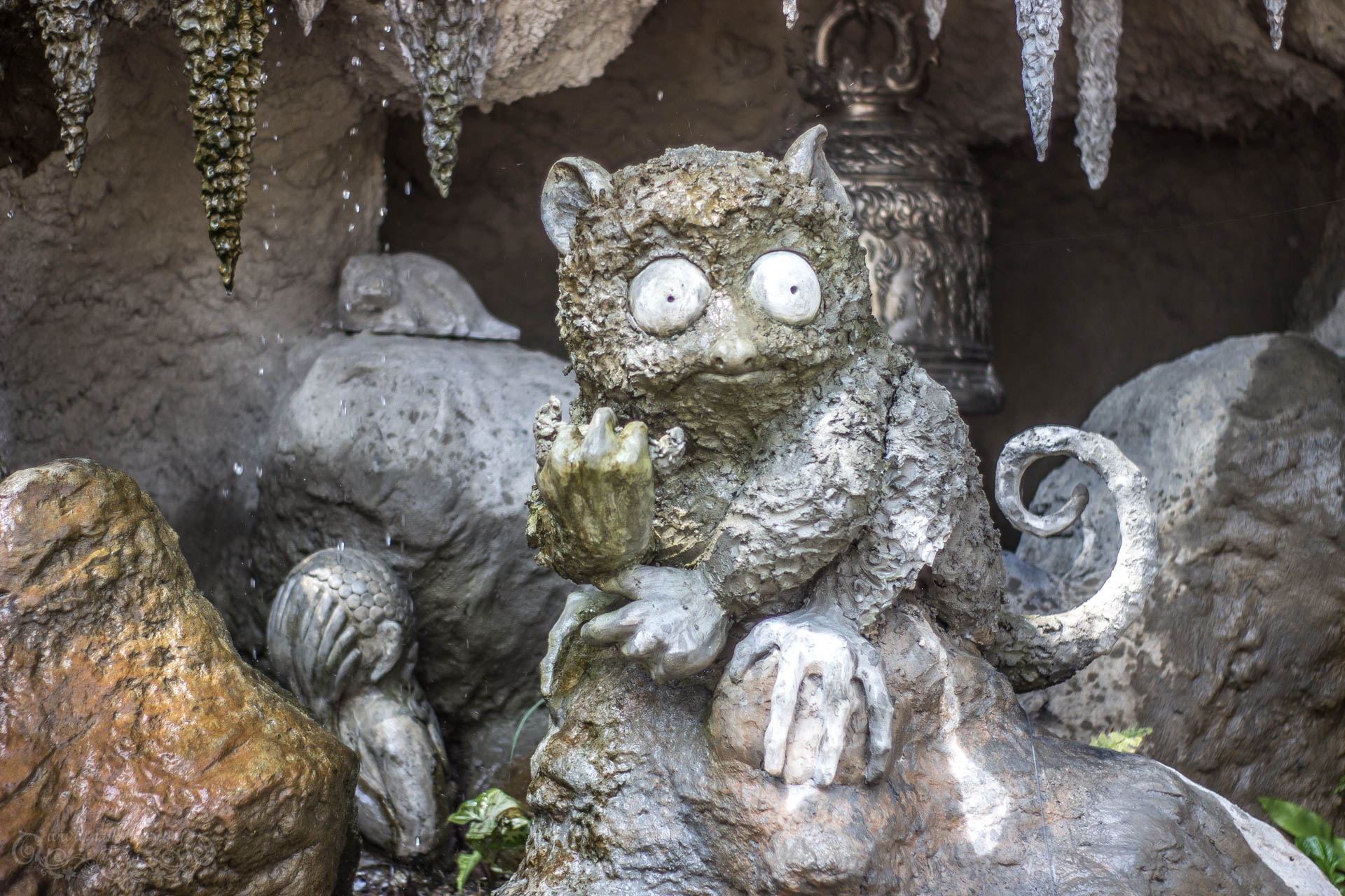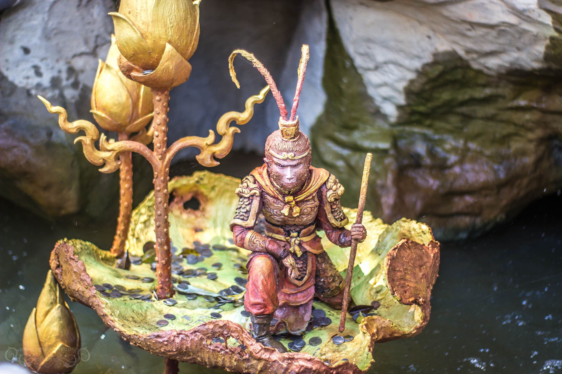 Comme la dernière fois, je m’attarde à l’intérieur du temple principal – où les photos sont interdites – et nous cherchons avec Lunie les différentes références « pop culture » qui se cachent dans les peintures décoratives. Le parc extérieur mêle lui aussi ornement religieux et culture populaire :